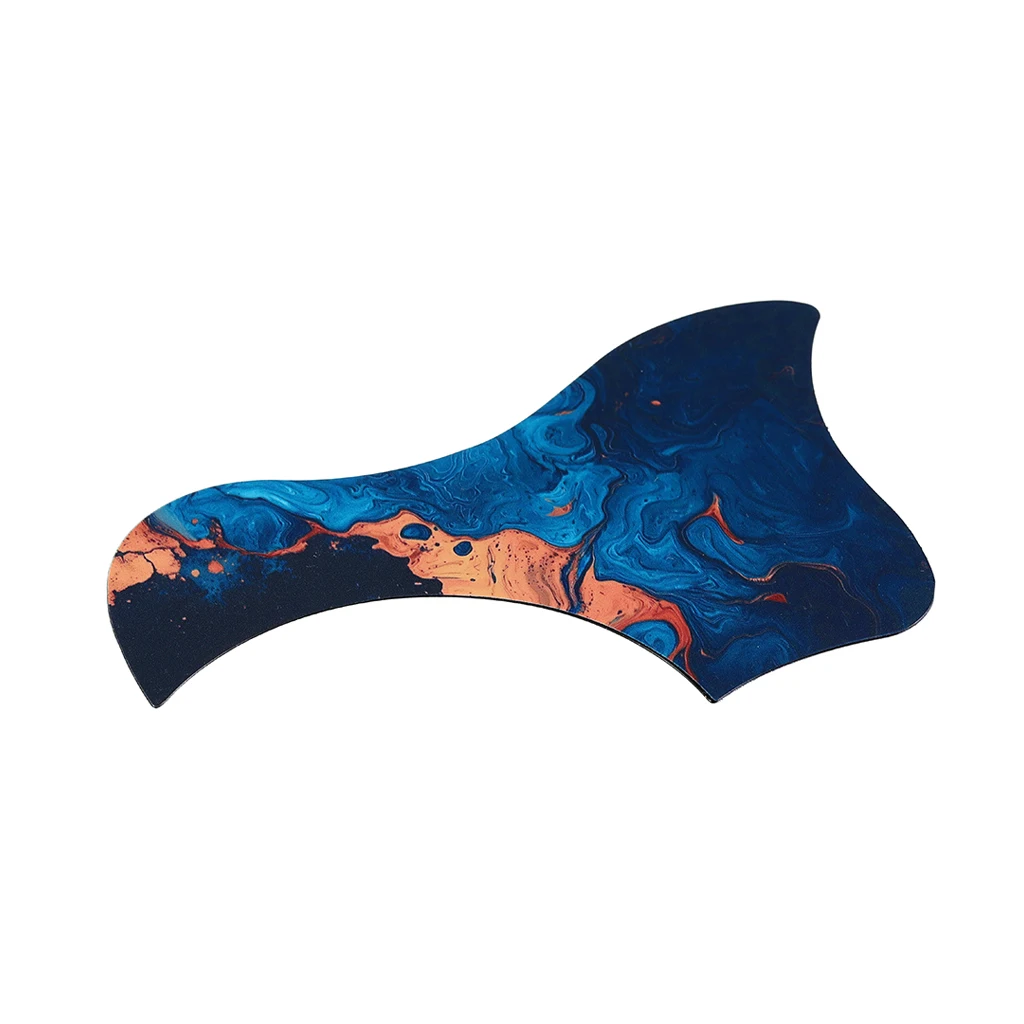 Enhance and protect your 40-41 inch acoustic guitar with this vibrant, self-adhesive clear pickguard. Crafted from high-quality, durable plastic, it features an eye-catching marbled swirling pattern with bold shades of blue, accented by hints of orange, peach, and dark navy, all finished with a glossy surface that enhances its visual appeal. Its irregular, contoured shape seamlessly fits your guitar’s body, providing anti-scratch protection against wear and tear. Easy to install with an adhesive backing, this stylish pickguard is perfect for replacing worn or damaged parts, combining functional protection with artistic flair to elevate your instrument’s look and durability.
