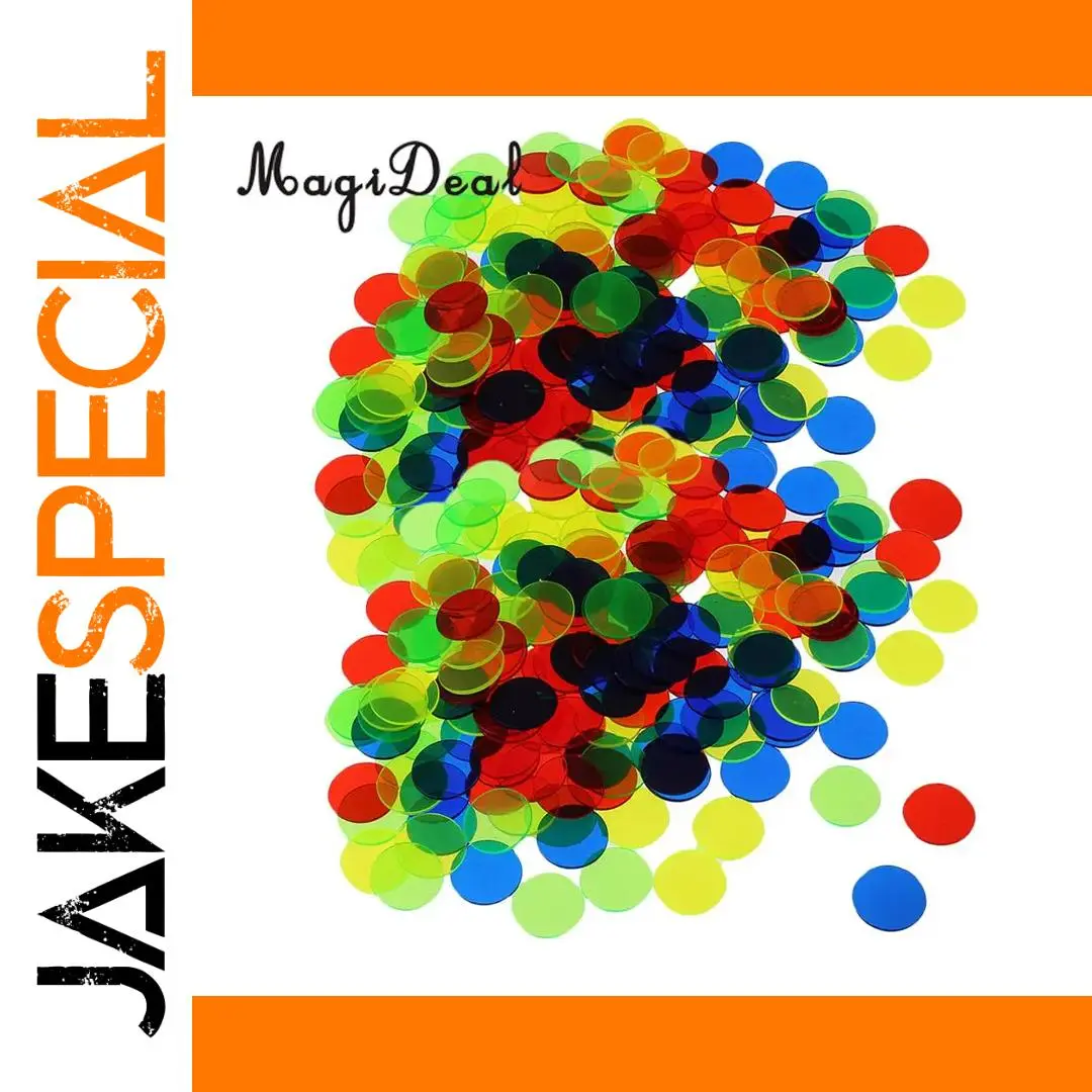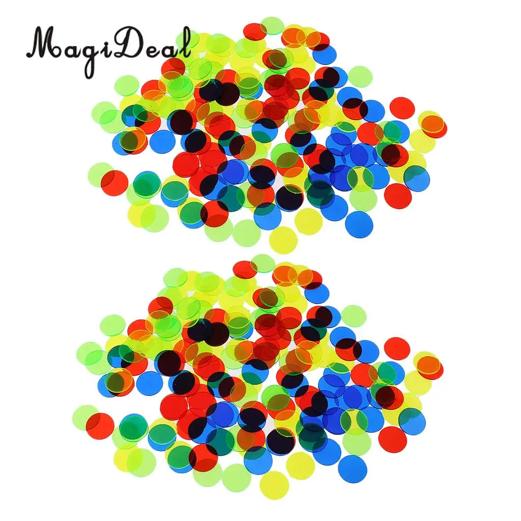 Enjoy vibrant gameplay with this set of 200 translucent plastic bingo chips, each measuring approximately 1.9 x 1.9 cm (0.74″) and 3/4 inch in diameter. The chips come in vivid colors such as red, green, blue, yellow, and black, featuring a glossy, semi-transparent finish that allows light to pass through for easy visual identification of called numbers. Designed for use with bingo cards, poker, and board games, these durable, smooth-surfaced chips are perfect for classroom, carnival, or casual gaming. Enhance your game nights with these colorful, high-quality chips that make every call visually clear and engaging.