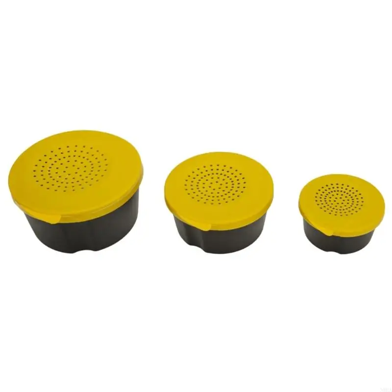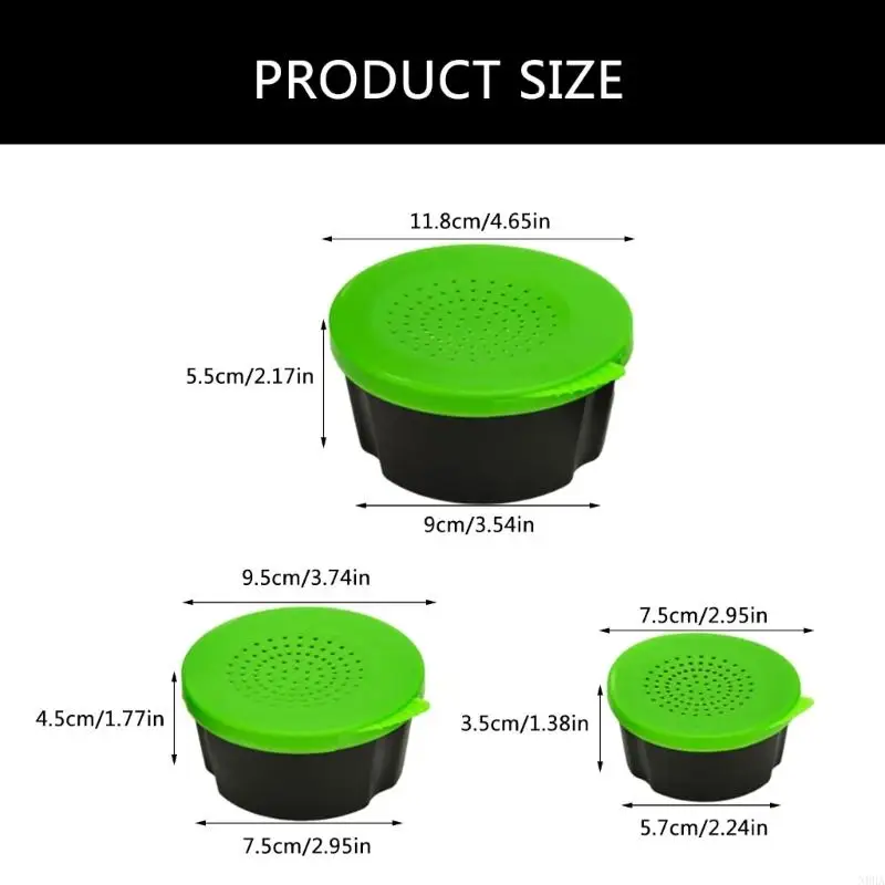 - Lids have a smooth, slightly domed shape with textured surfaces, including small concentric holes for optimal ventilation and drainage to keep bait fresh.