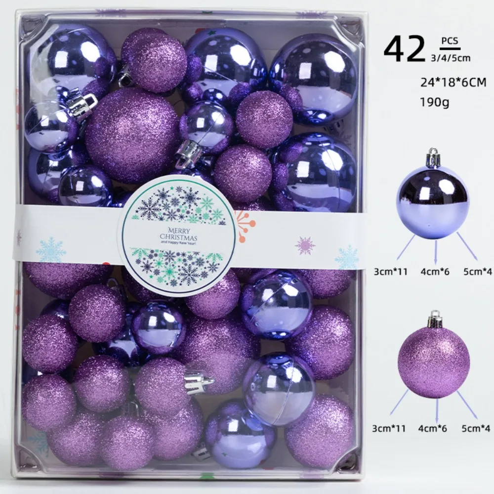 Transform your holiday atmosphere with this bright and festive set of 42 plastic Christmas balls. Featuring seven lively colors—purple, rose gold, blue, pink, gold, green, and red—these ornaments bring a cheerful burst of energy to your decorations. Available in three different sizes—3cm, 4cm, and 5cm—they add visual depth and variety to your tree, mantels, or party decor. The mix of glossy and matte textures, along with glittered and speckled finishes, creates an eye-catching contrast that reflects light beautifully. Lightweight and easy to hang with gold-colored caps and built-in loops, this set guarantees a stunning holiday scene. Their durable plastic design ensures safe, long-lasting use throughout every celebration, making decorating effortless and fun.