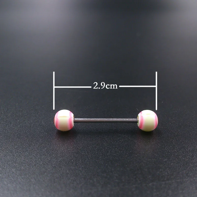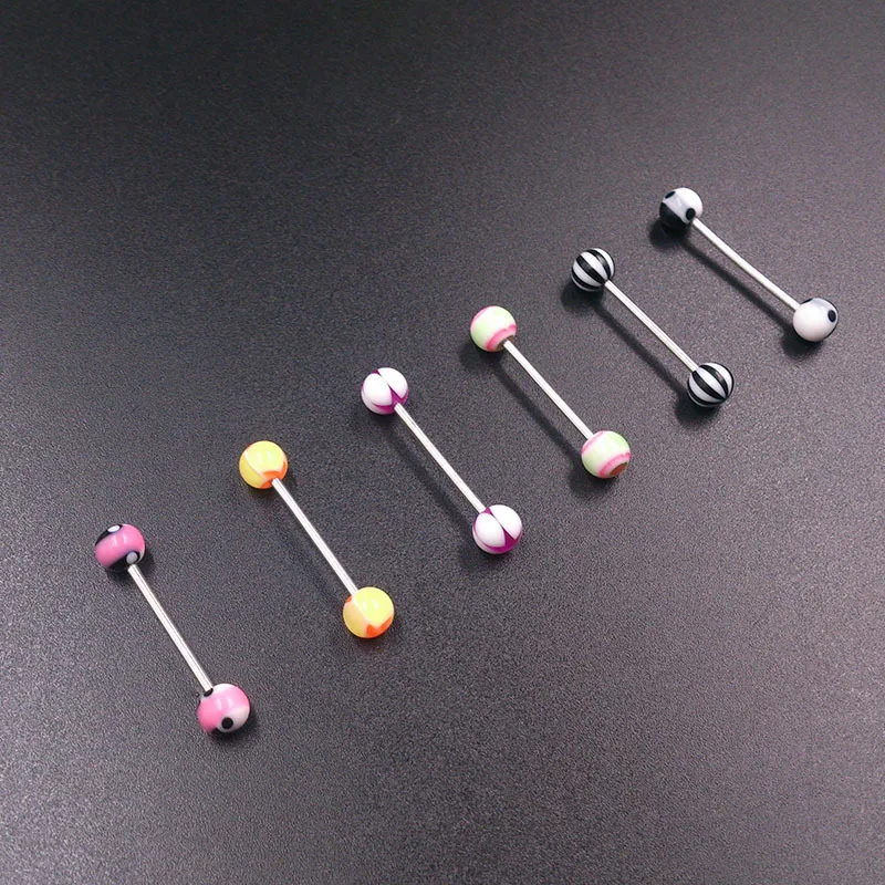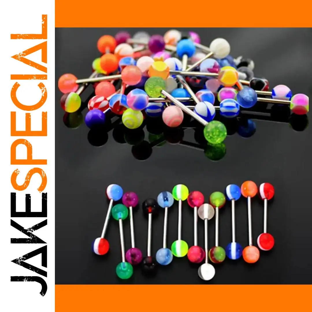 Imagine elevating your body jewelry collection with this eye-catching set of 10 acrylic tongue and nipple rings. Designed with high-quality 316L surgical steel and a sleek barbell style, each piece features a 28mm round, smooth, and shiny ring. The 6mm acrylic balls come in a lively array of solid, marbled swirl, and striped patterns, adding bursts of color and personality to your piercings. Whether you want to make a bold style statement or add a playful touch to your daily look, these hypoallergenic rings are perfect for tongue, nipples, or other body piercings. Durable yet comfortable, they offer long-lasting vibrancy that complements your vibrant personality.