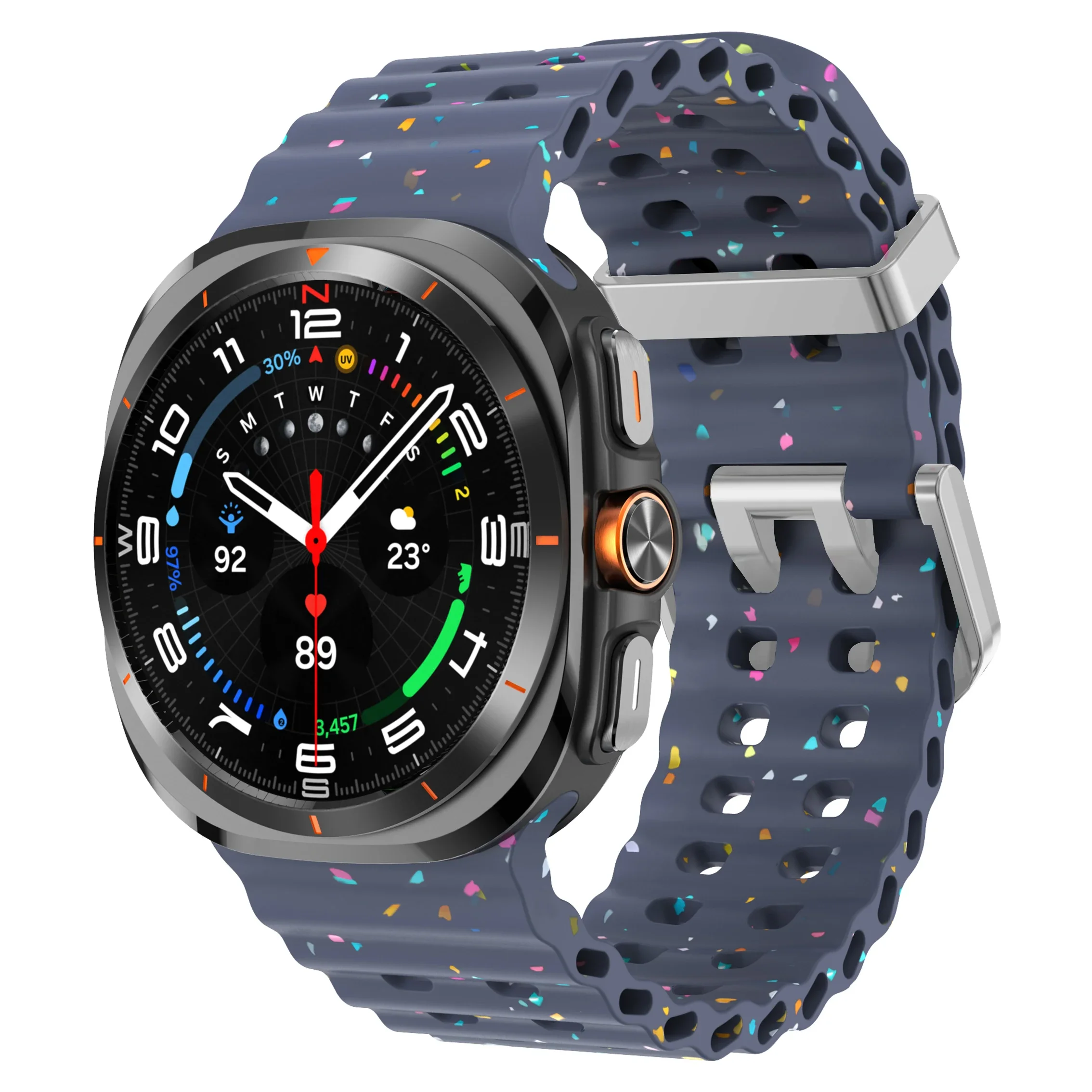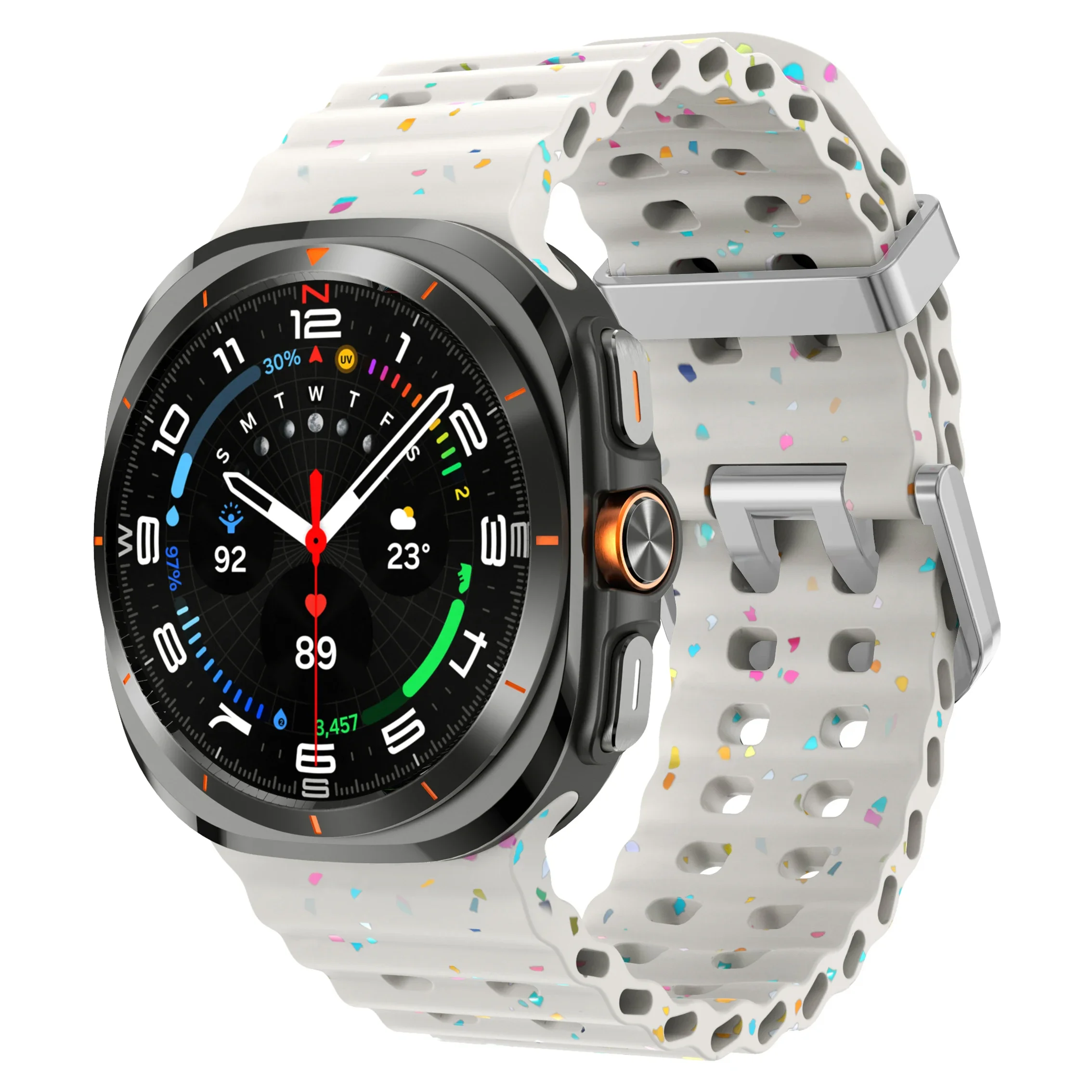 Enhance your Galaxy Watch 7 Ultra 47mm with this durable silicone strap, featuring a vibrant multicolor confetti pattern on either black or white backgrounds. Made of flexible, high-quality silicone, it offers a comfortable fit for both men and women and fits 20mm lug width securely without gaps. Available in a variety of lively colors, including luminous black, silver shades, army green, red, yellow, blue, pink, and star light, this stylish replacement band is designed to match your personal style while providing lasting durability. Please note, the watch is not included.