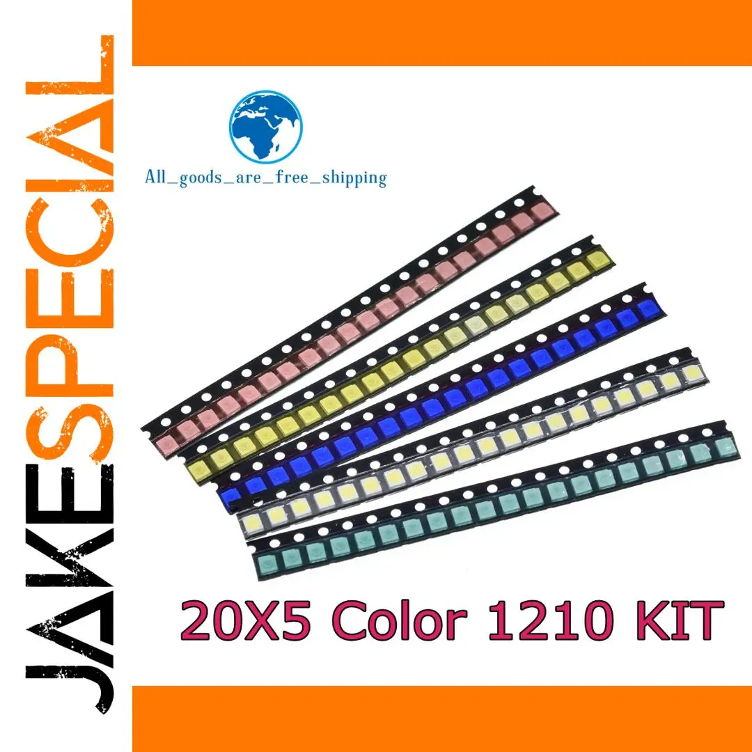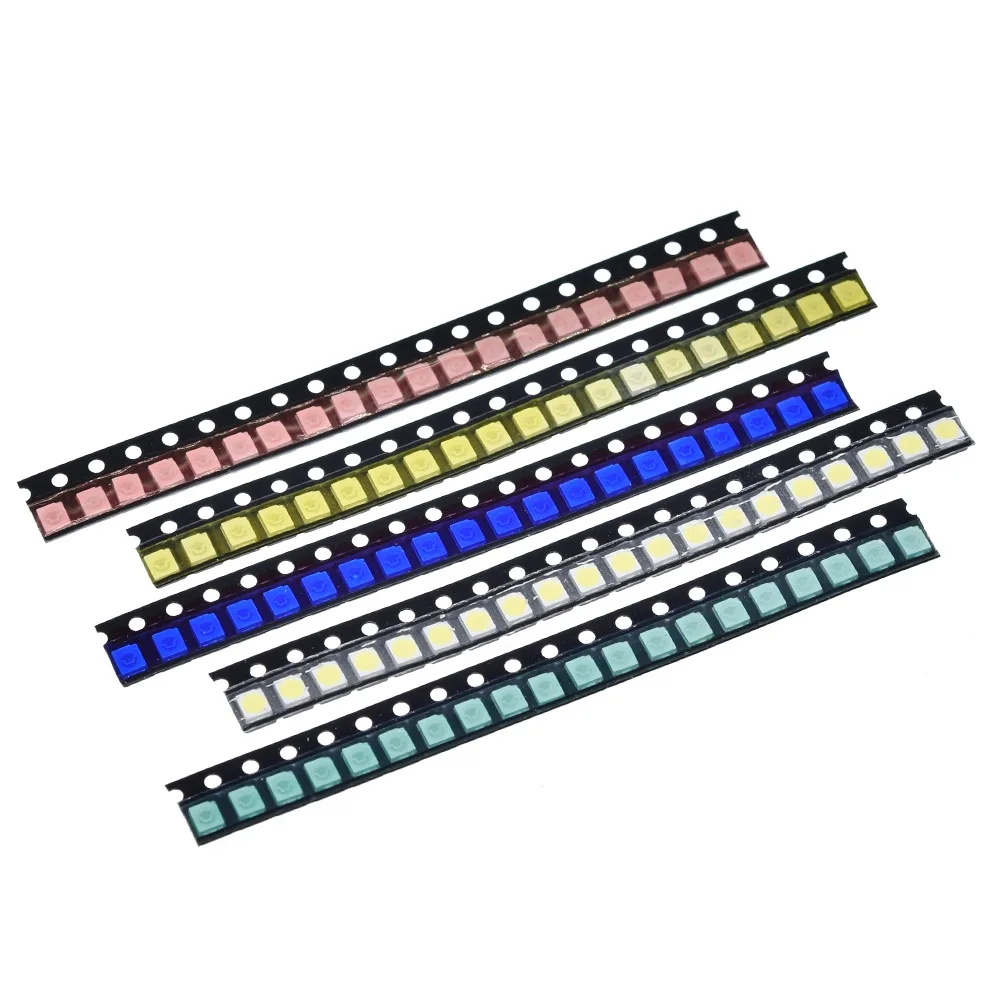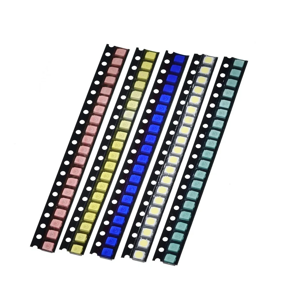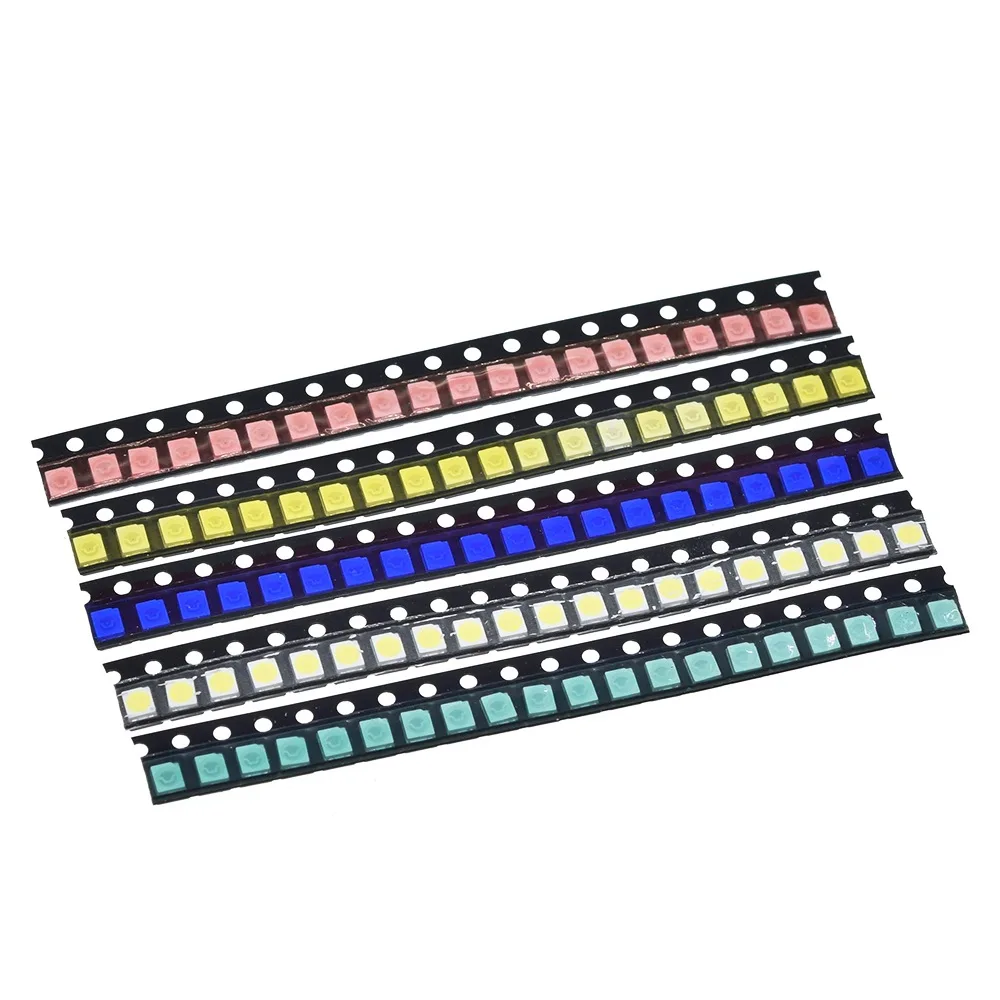 Enhance your electronic projects with this set of 100 high-quality SMD 1210 LED diodes available in five vibrant colors: red, yellow, green, blue, and white. Each LED operates at specific voltages—red and yellow at 2-2.2V with brightness of 300-500 MCD and 180-300 MCD respectively; green at 3.2-3.4V with 850-900 MCD; blue at 3.3-3.6V with 180-300 MCD; and white at 3.2-3.4V with 1600-1900 MCD, emitting spectra from 465-625nm. Encased in clear, water-diffused resin, these sleek, black plastic strips provide a modern aesthetic for DIY applications, switches, and sensors.