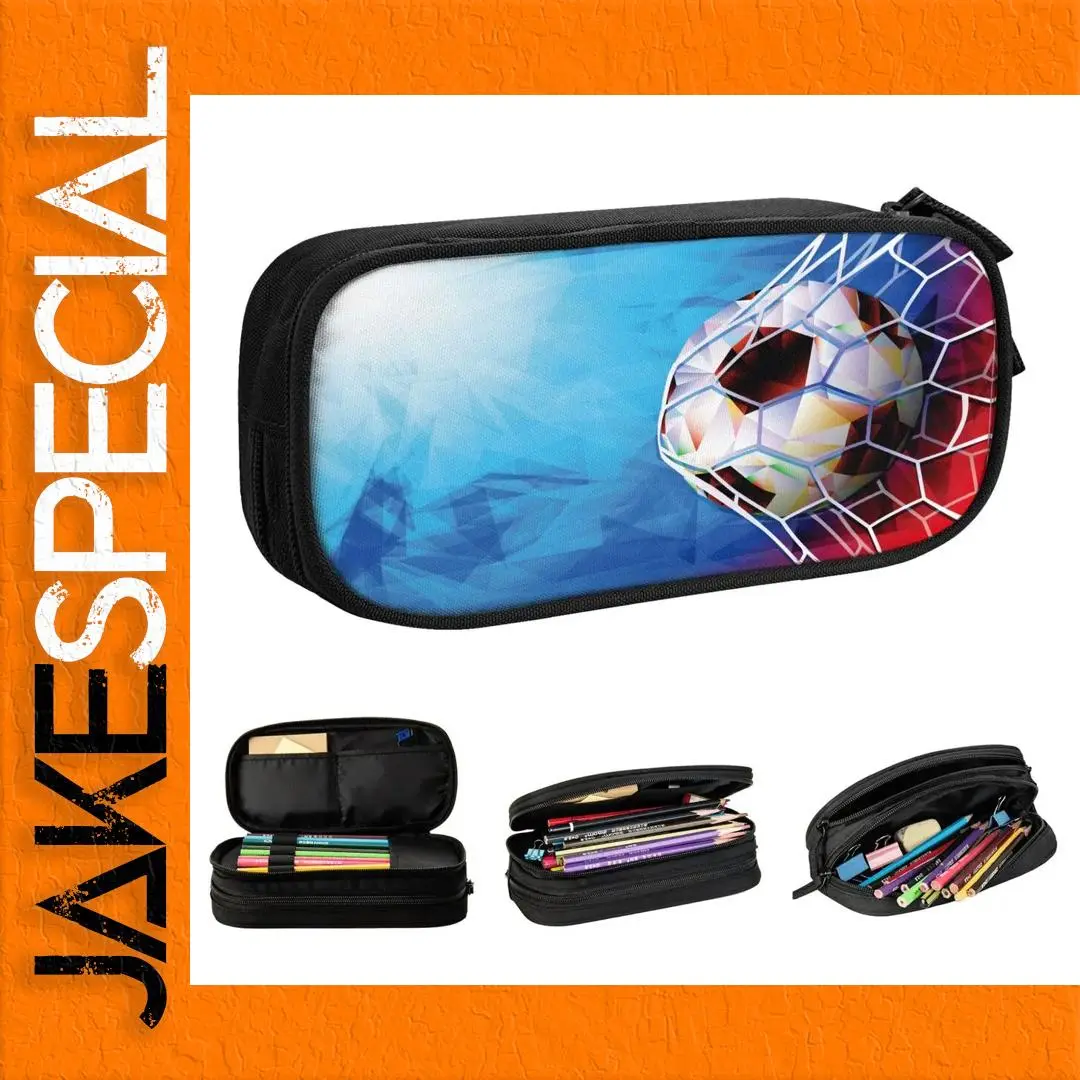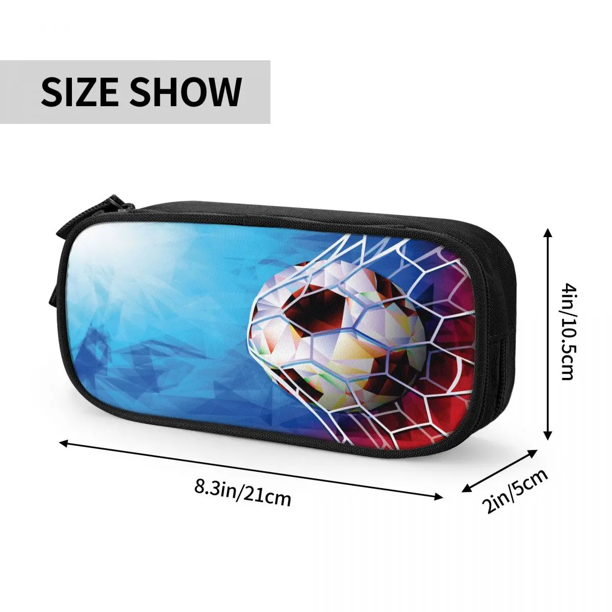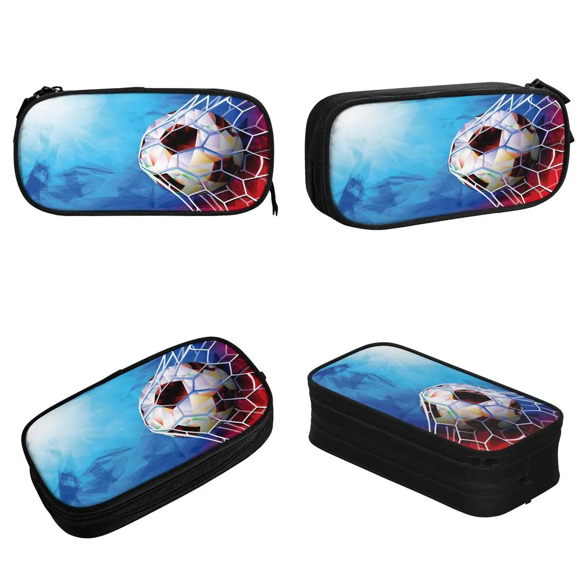This vibrant soccer-themed pencil case is perfect for students and sports enthusiasts alike. Featuring an eye-catching graphic of a soccer ball hitting the net against a dynamic blue background, its colorful design exudes energy and liveliness. Made from smooth leather with a glossy finish, this case not only appeals aesthetically but is built for durability. The accessible zipper closure makes it easy to store your favorite writing instruments or cosmetics. With a spacious interior lined with contrasting black fabric, you can imagine neatly organizing your pens and pencils, making every school day or office task a bit more fun.