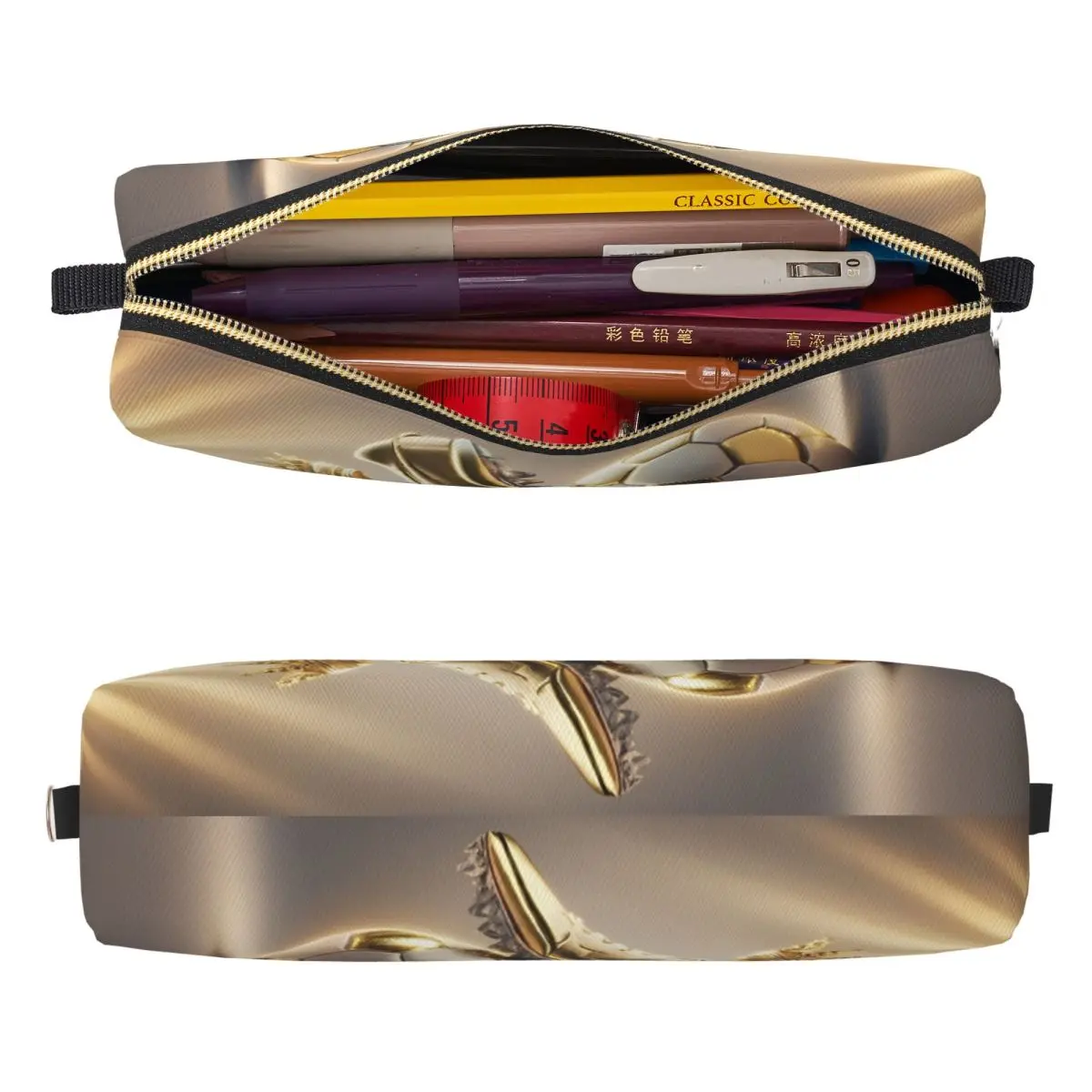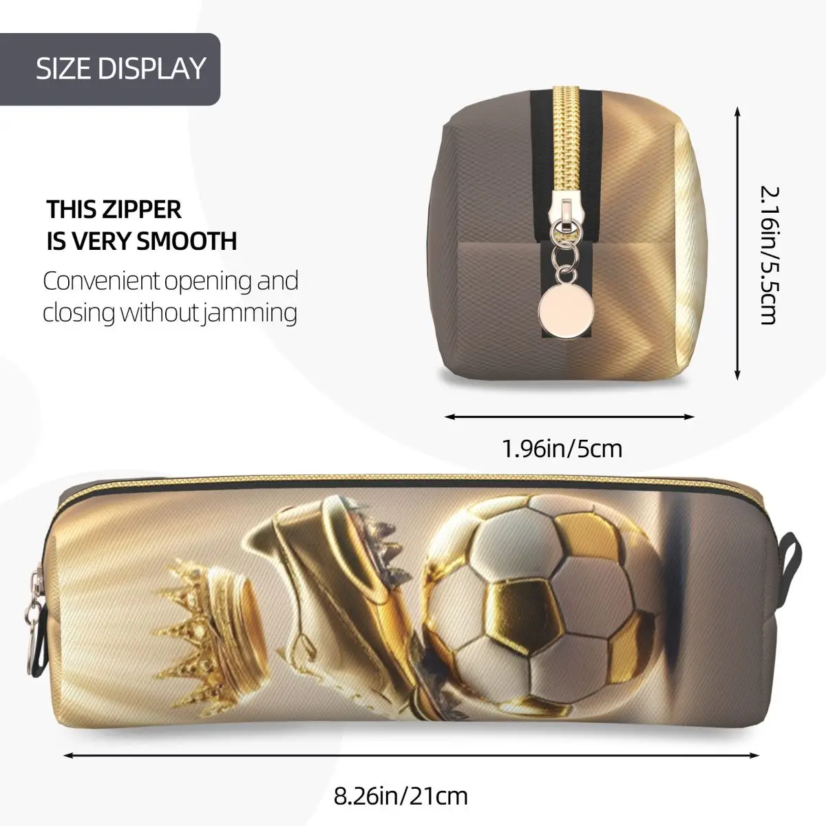 Elevate your stationery game with this vibrant Soccer Pencil Case, specially designed for sports enthusiasts and stylish individuals alike. The elongated rectangular shape, coupled with a glossy gradient that transitions from light gold to a deeper hue, makes this case a must-have. The enchanting design features a detailed soccer ball, a shining gold soccer shoe, and a regal golden crown, blending sporty flair with luxury. Constructed from durable leather, this case not only offers a soft touch but also ensures longevity for your everyday needs. With ample storage capacity, it’s perfect for holding pens, pencils, and other essential items, making it ideal for both school and office settings.