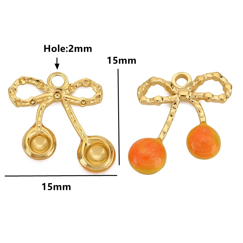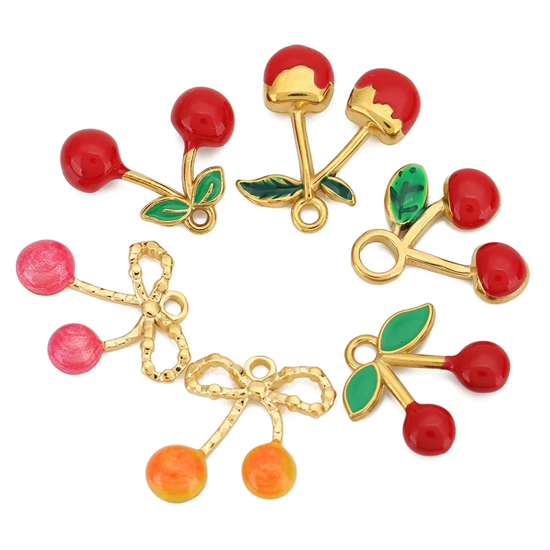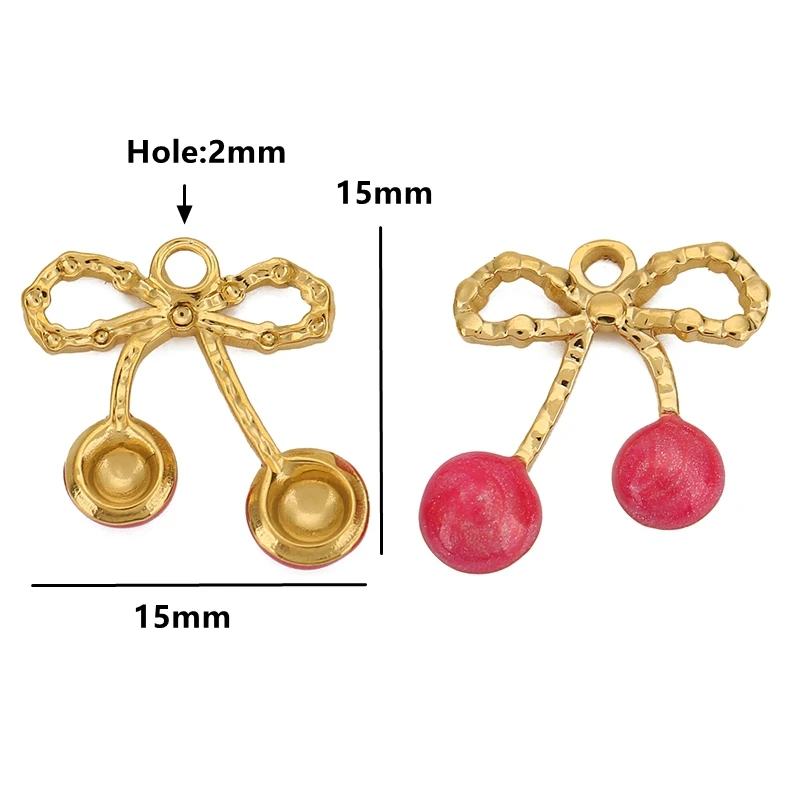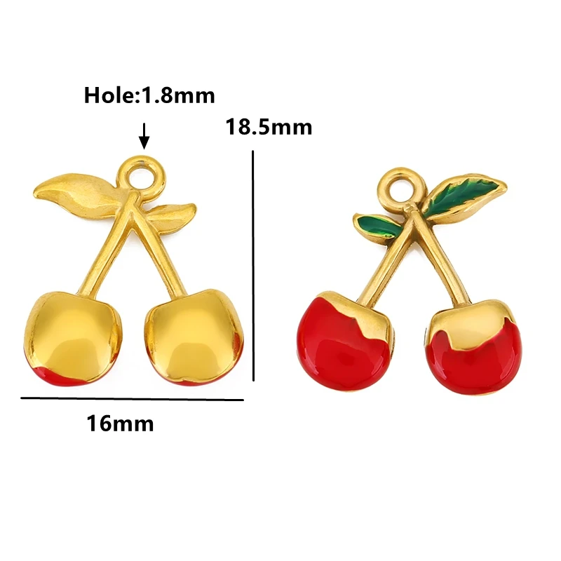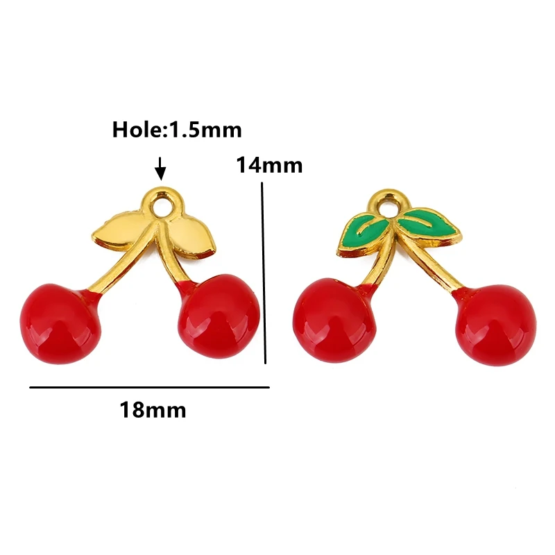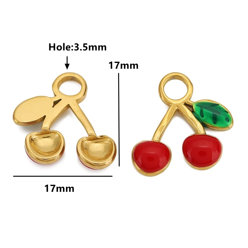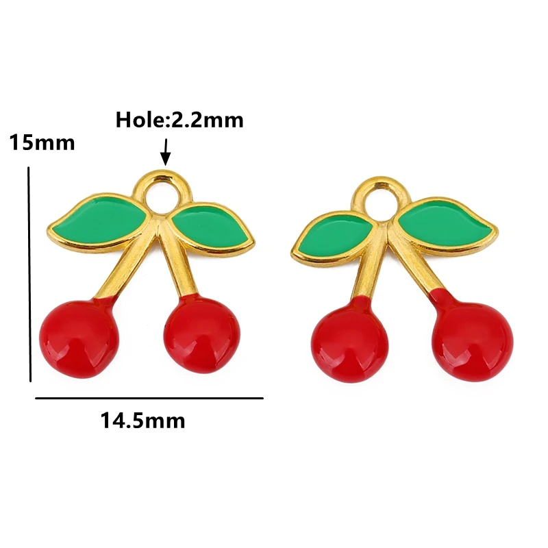 - Set includes 3 vibrant stainless steel cherry charms with enamel coloring, perfect for DIY jewelry like earrings, necklaces, bracelets, or keychains. Durable and resistant to tarnishing. Approximate size 1-3mm.