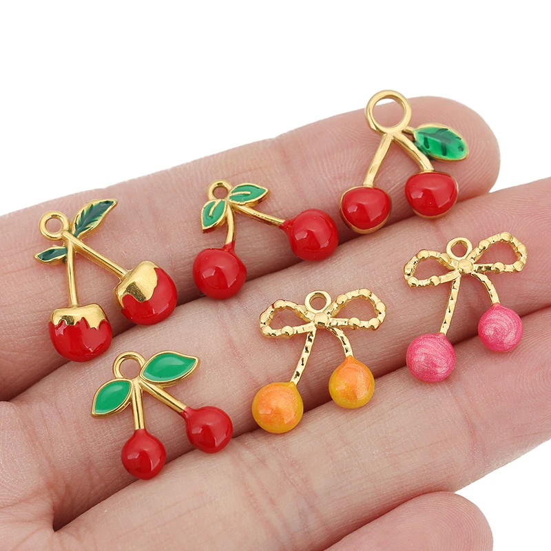 - Each charm features a playful cherry shape with contrasting metal accents, including slender stems and textured tops, adding an adorable and unique aesthetic to your crafts.