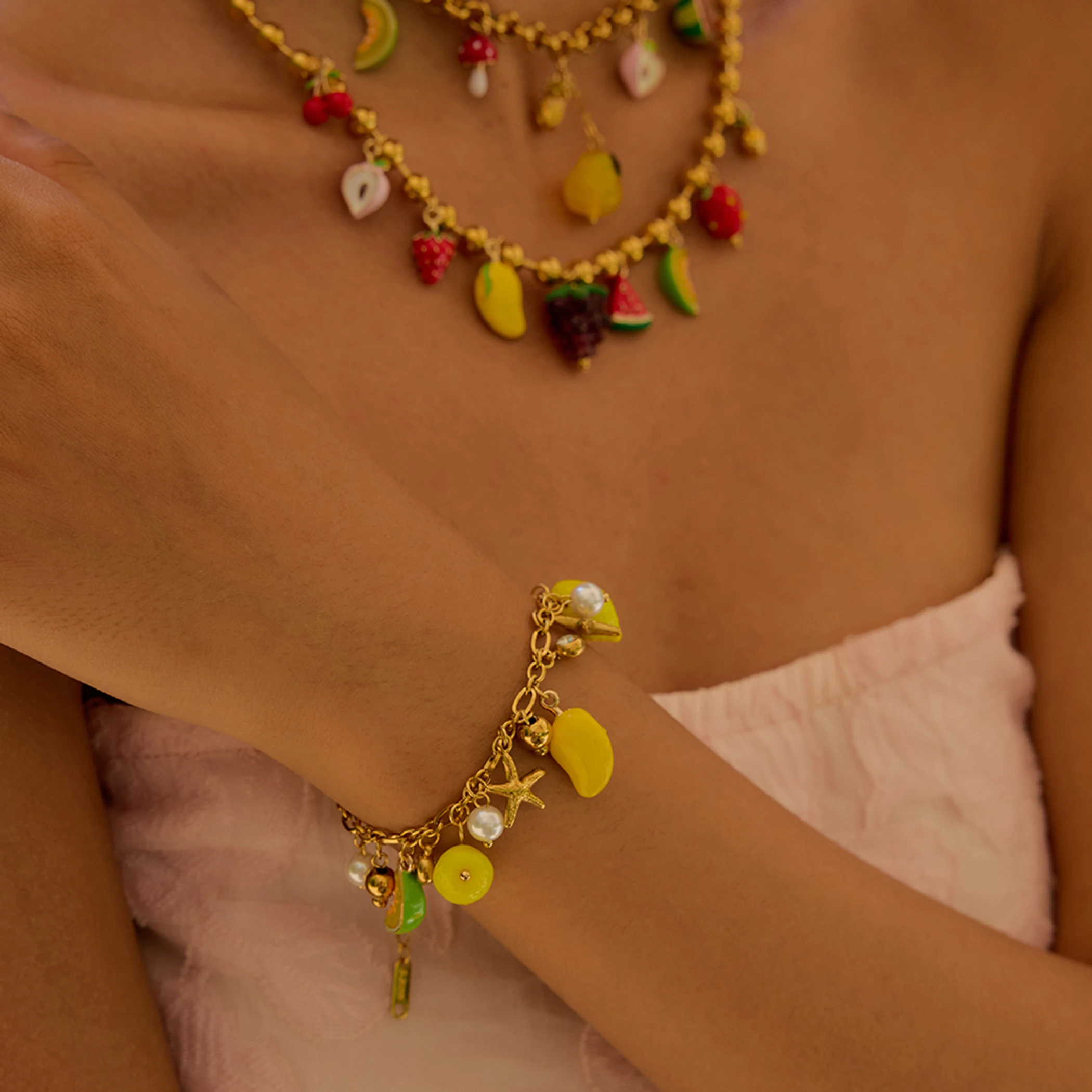- Decorated with textured, brightly colored charms including lemon-shaped in vivid yellow and mango-shaped in yellow-green, offering a lively and eye-catching summer aesthetic.