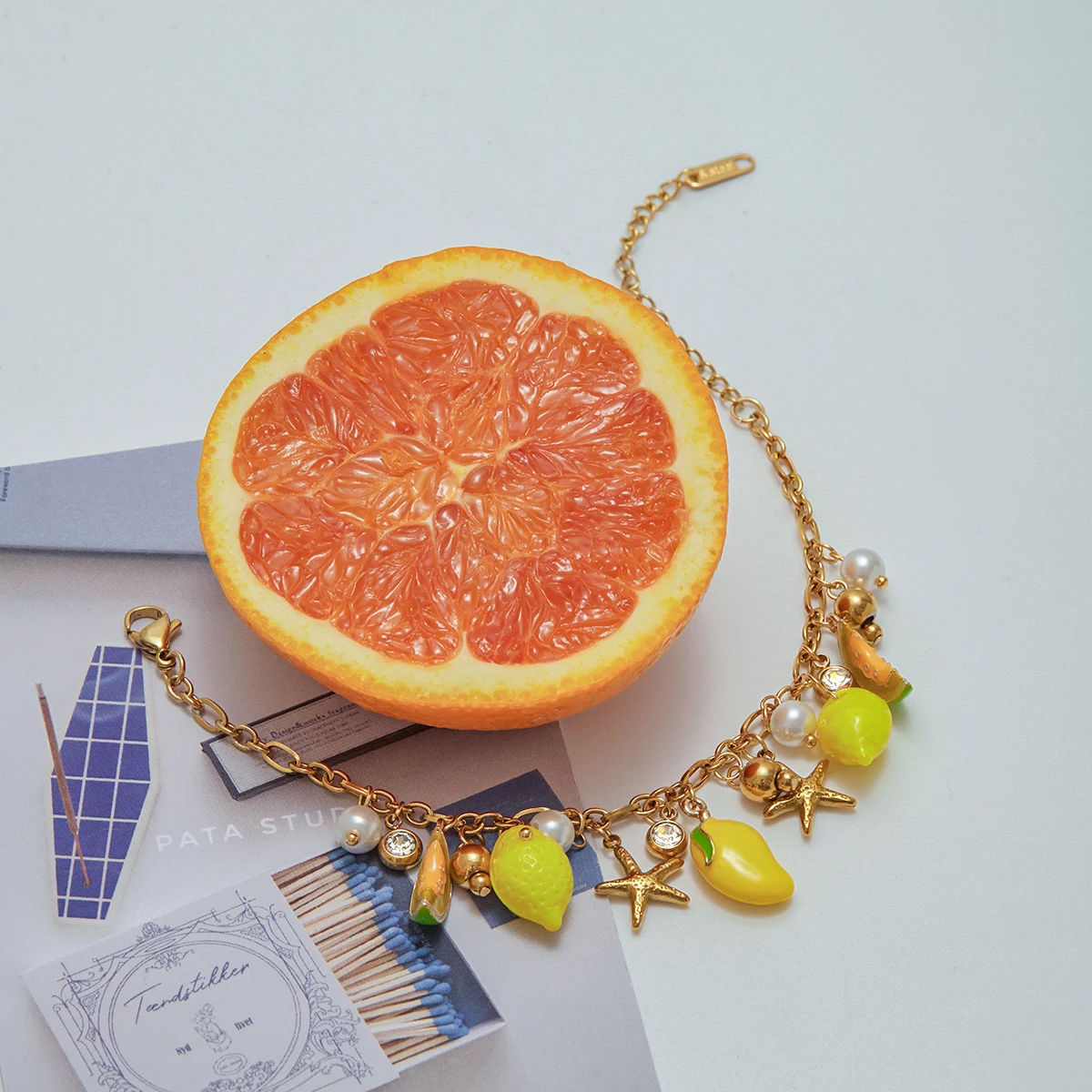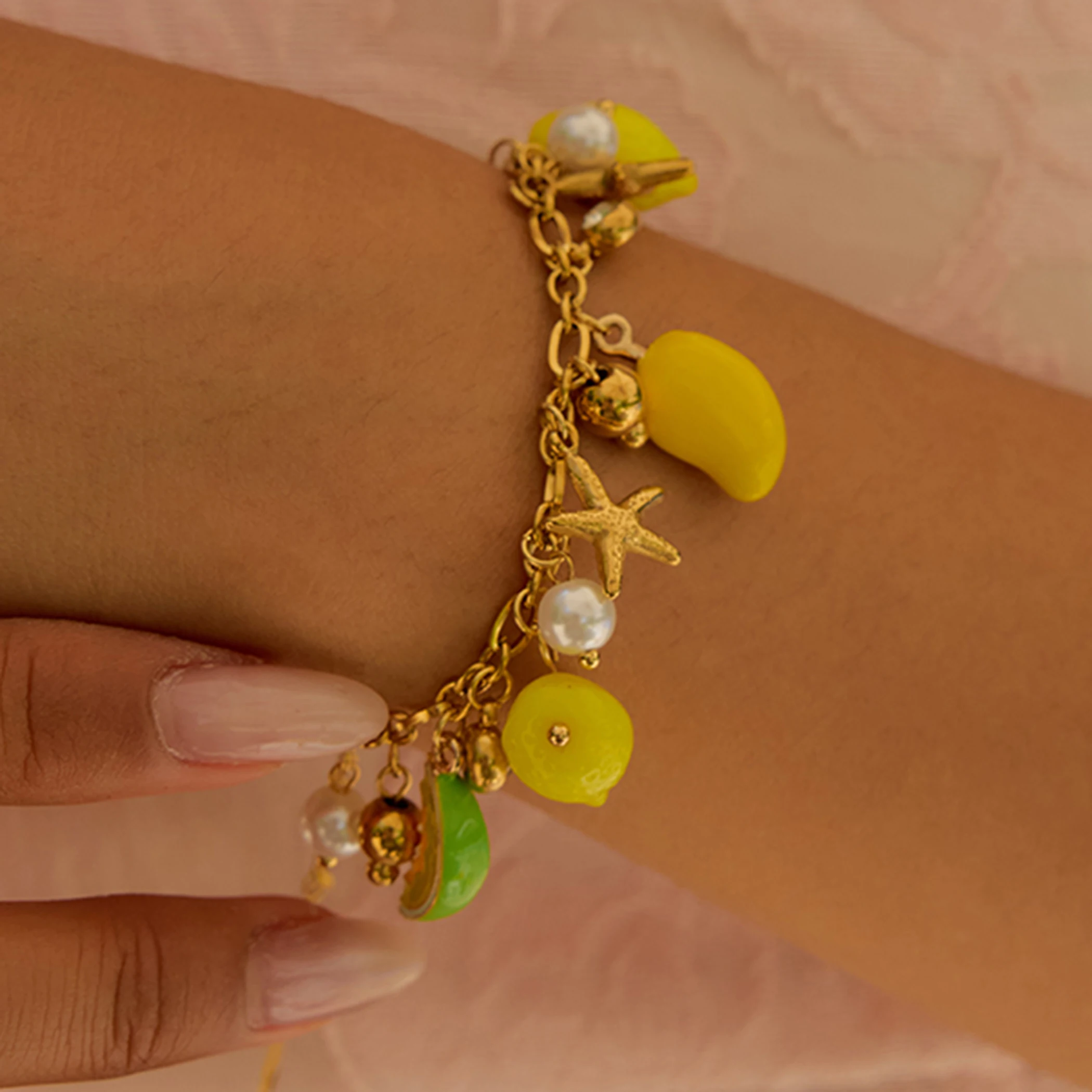 Imagine yourself effortlessly radiating youthful energy with this stunning summer-inspired charm bracelet. Crafted from high-quality stainless steel with a shiny, waterproof finish, it’s built for durability and everyday wear. The bracelet's playful design features a lively chain with an adjustable extension, ensuring a perfect slip-on fit for any wrist size. Adorned with textured, colorful charms like bright yellow lemon-shaped elements and yellow-green mangoes evoke fresh summer fruit, while metallic gold starfish charms add a seaside touch. Complemented by glossy white pearl beads and sparkling rhinestones, this piece captures the essence of carefree, vibrant summer days. Its irregular charm placement offers a dynamic, lively aesthetic that perfectly highlights your fun-loving personality and love for vibrant fashion, making it a versatile accessory for all occasions.