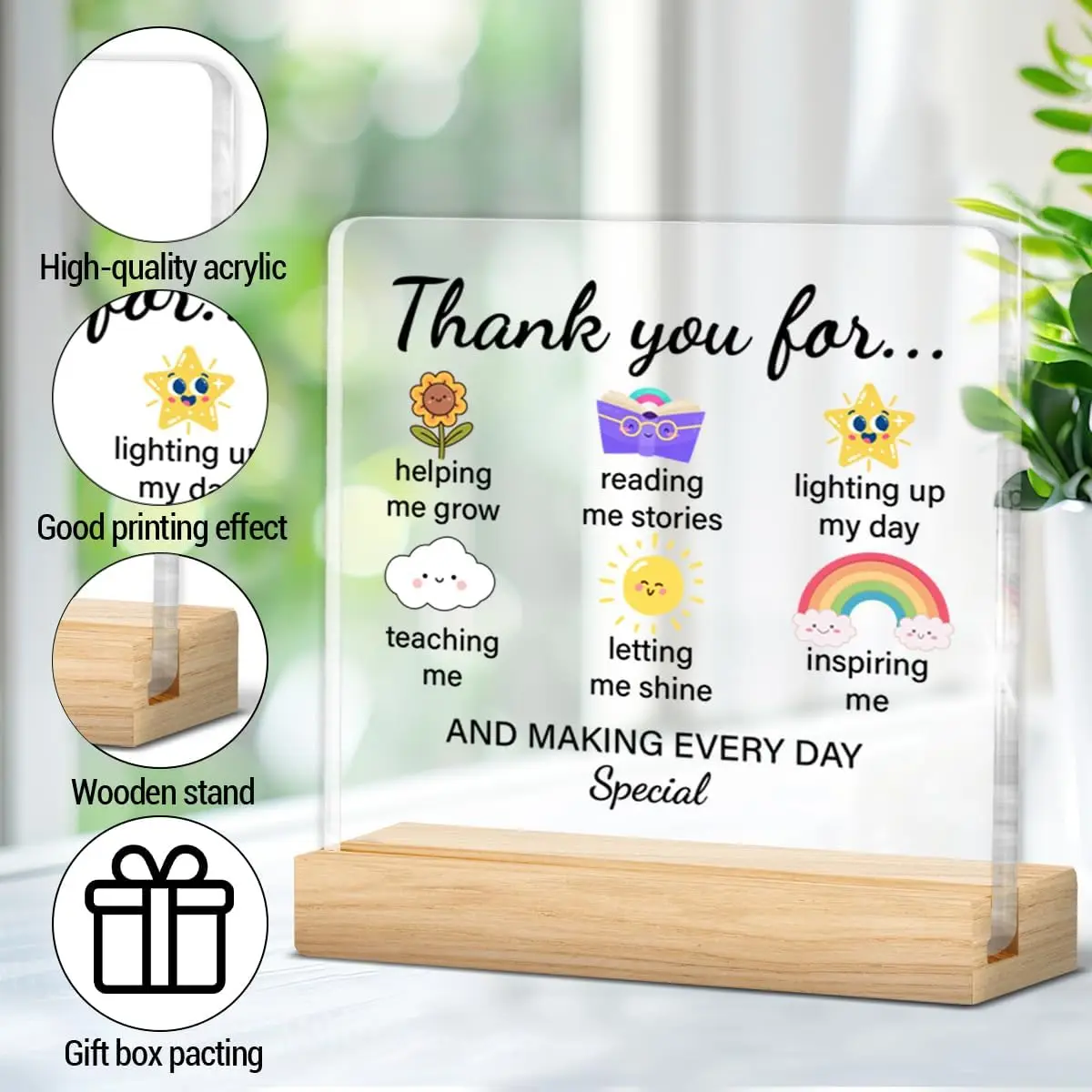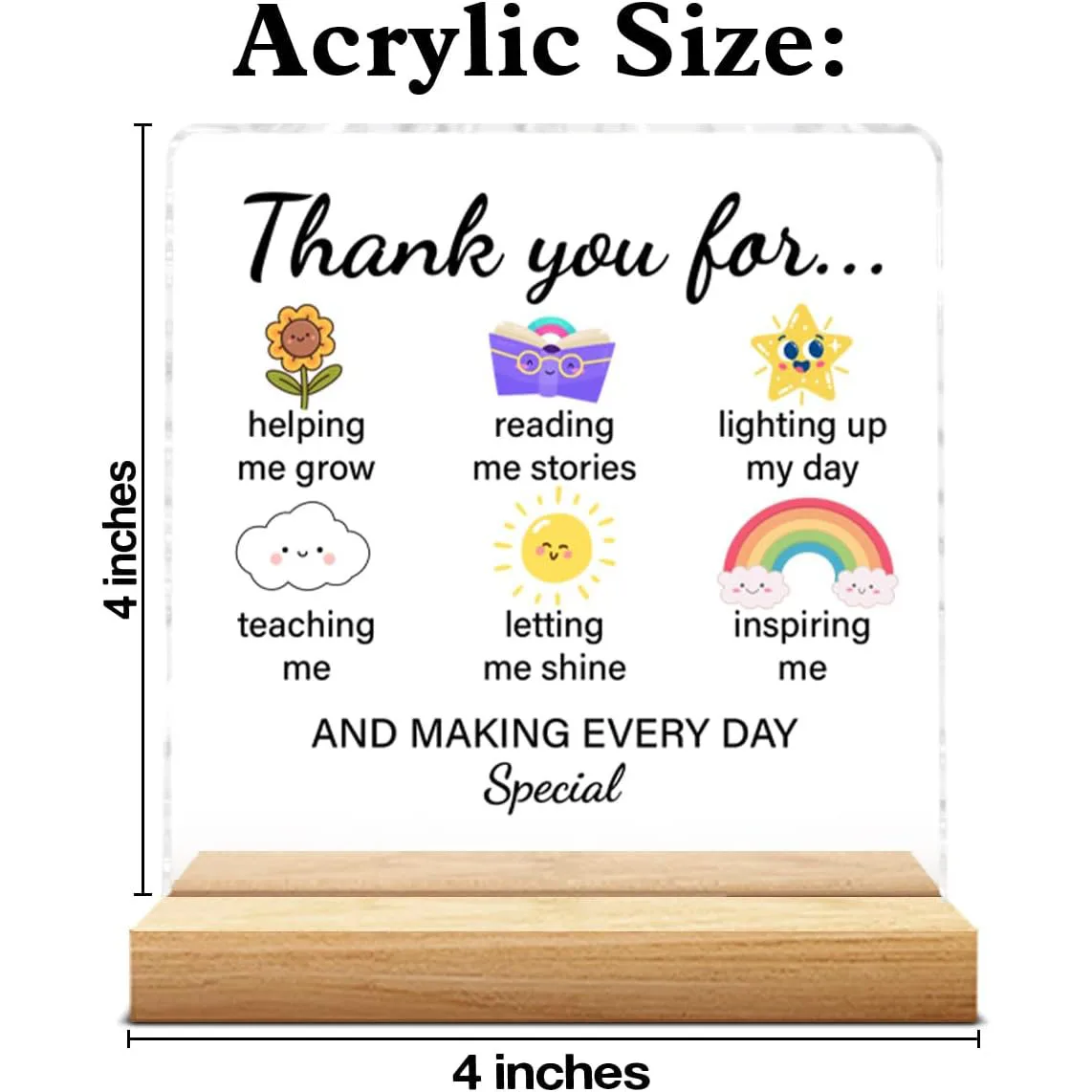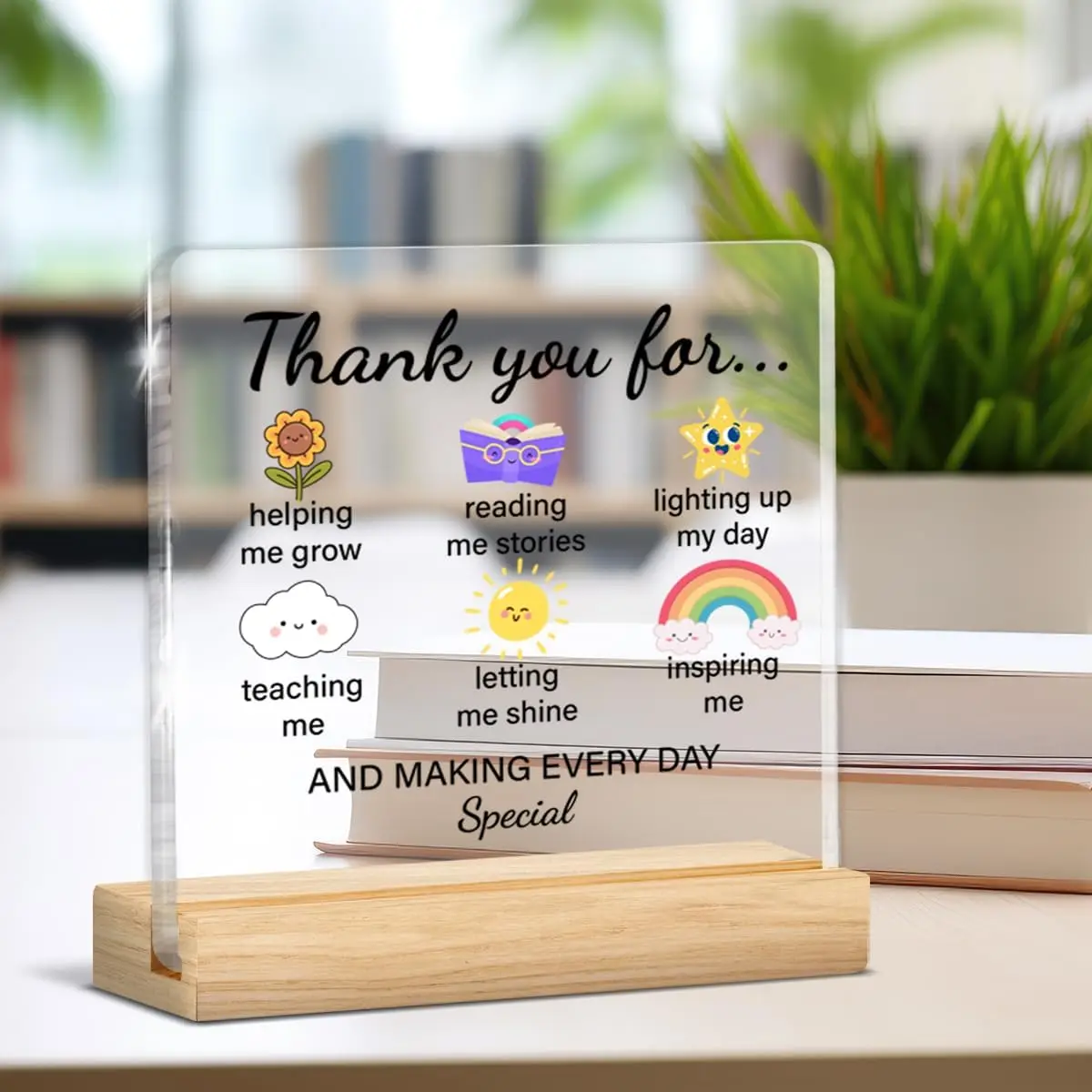Imagine expressing your heartfelt gratitude with this vibrant teacher appreciation plaque that radiates warmth and joy. Crafted from durable plastic, the rectangular panel features playful illustrations and a touching message, making it perfect for honoring educators. Its colorful design includes a smiling sunflower, cheerful book with glasses, sparkling star, cute cloud, radiant sun, and a vibrant rainbow, all paired with inspiring phrases. The sleek, rounded edges lend a modern look, while the wooden base provides stability. Ideal for any occasion—be it the end of the school year or a birthday—this gift will bring a smile to any teacher's face. Personalize your appreciation and create lasting memories with this charming token of thanks.