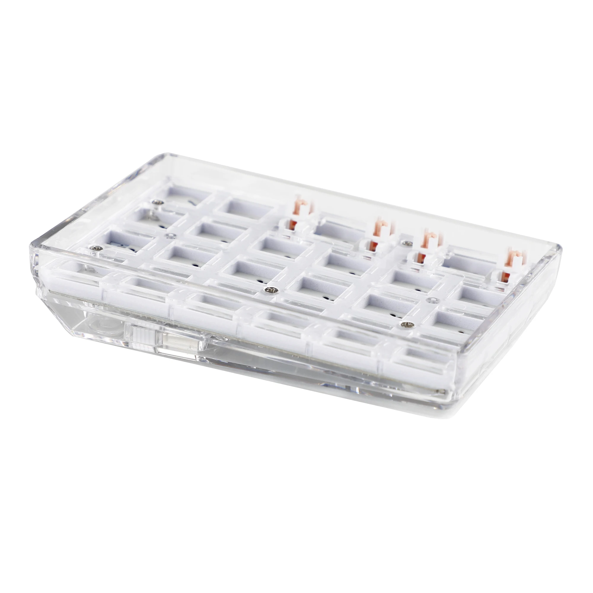 Experience the ultimate showcase of colorful mechanical keyboard switches with this transparent PC case. Crafted from high-strength polycarbonate, it provides a durable and sleek platform to display your switch collection. The vibrant internal LED lighting illuminates each switch in lively hues of blue, pink, red, green, and yellow, creating a captivating, multicolored visual effect. Designed for enthusiasts, this case supports three connection modes—wired via USB, 2.4G wireless, and Bluetooth 4.0—for flexible, high-performance use. The fully programmable PCB allows customization of lighting effects and functions, with a 32-bit MCU and three RGB channels supporting over 16.8 million colors. The included EVA foam reduces noise, enhancing both aesthetics and acoustics. This display case is perfect for collectors seeking a modern, high-tech look for their keyboard setup.