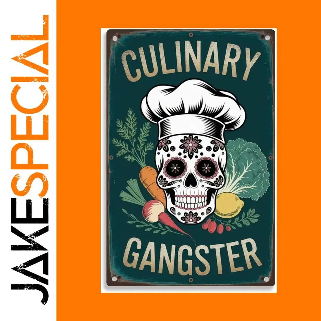 Transform your space with this captivating vintage-style tin sign that features an eye-catching Mexican Day of the Dead-inspired design. The dark teal background, subtly distressed edges, and colorful floral and vegetable details create a nostalgic yet lively aesthetic perfect for enhancing your home, bar, cafe, or garage. The central playful sugar skull, decorated with intricate floral motifs and topped with a chef’s hat, adds a whimsical touch. The bold beige lettering of “CULINARY” and “GANGSTER” complements the vibrant imagery, blending vintage charm with artistic flair. Lightweight at approximately 120 grams, it's easy to hang indoors or outdoors using the included double-sided tapes. Make your space stand out with this unique decorative piece.