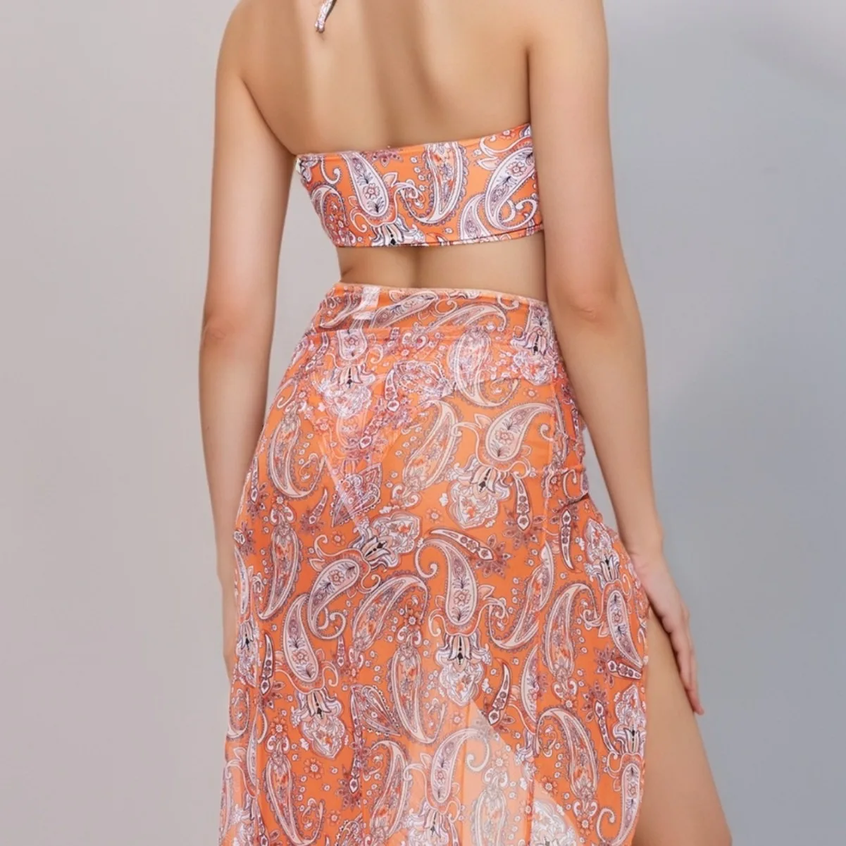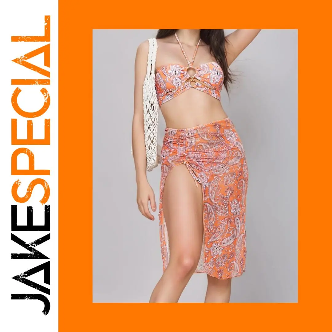 Experience a bold, glamorous look with this vibrant women's bikini set from ANENG, designed to make you stand out at the beach or poolside. Crafted from high-quality elastic nylon, it offers a soft, quick-drying feel that supports active water activities while maintaining durability and resistance to shrinking. The beautiful printed pattern in bright orange or blue captures attention and complements your confident, sexy style. The set includes a strapless, backless top with chest pads for a seamless silhouette, paired with a high-waisted bottom featuring side cut-outs for added allure. The long, flowy midi skirt matches the playful pattern, completing a chic, fashionable ensemble. Whether swimming or relaxing, this outfit combines comfort with style effortlessly.