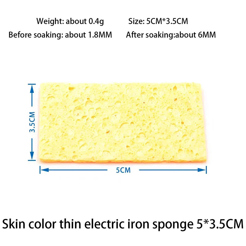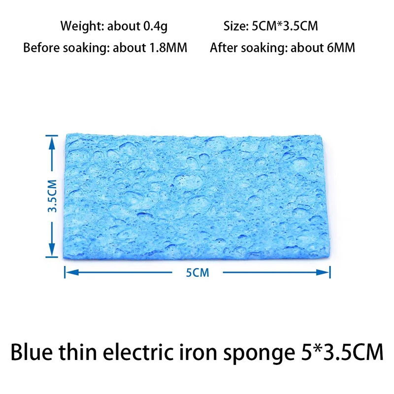 Enhance your soldering maintenance with this set of two rectangular cleaning sponges made from high-temperature resistant, sulfur-free wood pulp cotton. Measuring 5 cm by 3.5 cm with a 6 mm thickness, their smooth, textured surface effectively removes oxidized residues from soldering irons, ensuring optimal performance. Available in vibrant yellow and vivid blue, these minimalist, module-type sponges feature straight, clean edges, designed for durability and ease of use. Their compatibility with standard electrical setups makes them perfect for professional or hobbyist soldering stations, providing reliable cleaning in high-temperature environments while maintaining an organic, tactile aesthetic.