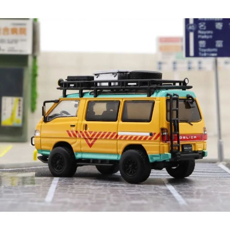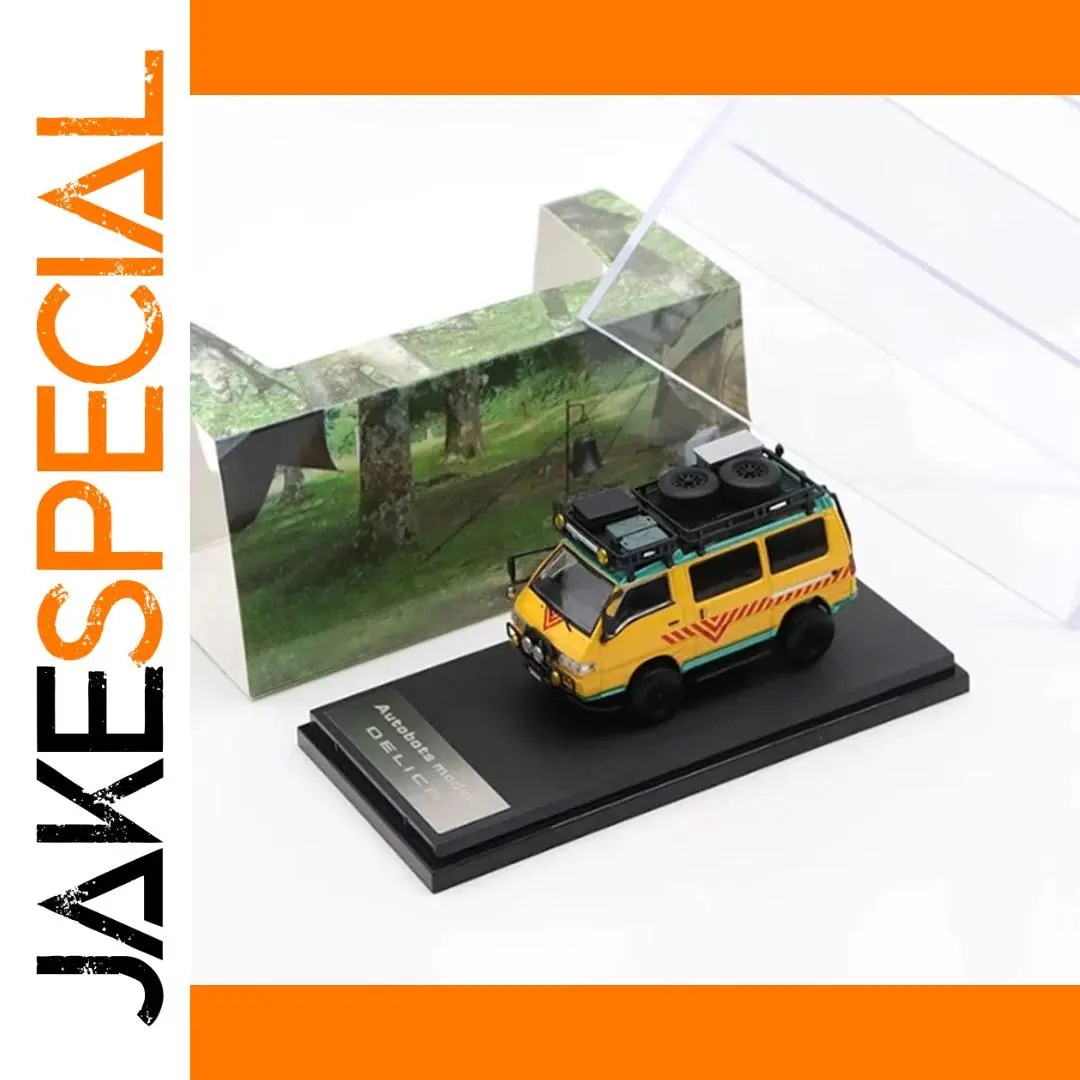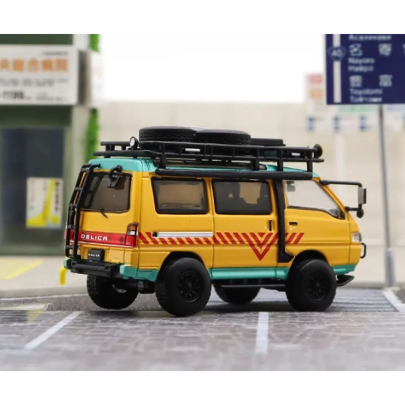 Imagine adding this striking mini replica to your collection, showcasing a sleek, glossy yellow finish that captures attention instantly. The compact, boxy design features sharp lines and accurate proportions, bringing a rugged, professional aesthetic to your display. Bold red and white diagonal stripes run across the front and sides, enhancing its eye-catching appeal. The tinted windows add realism, while the black roof accessories, including spare tires, containers, roof box, and antennas, provide intricate detailing. The black wheels with detailed lug nuts complete the authentic look. Perfect for collectors or enthusiasts, this model offers a bold, finely crafted representation of a four-wheel-drive van, ready to elevate your display with its vibrant color and high-quality finish.