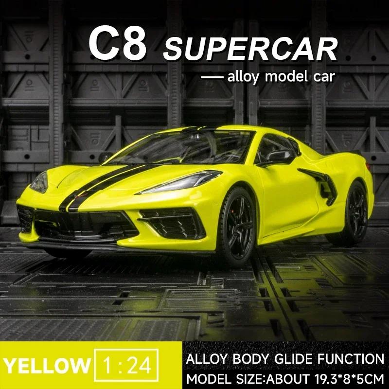 Step into the world of high-performance detail with this meticulously crafted 1:24 scale diecast alloy model of the 2020 Corvette C8. Featuring a stunning bright yellow finish accented by bold black racing stripes, this collectible exudes sporty elegance. The realistic metallic body combines diecast alloy and plastic for durability and authenticity, capturing the slick, aggressive lines of the original supercar. Its precisely designed vented hood, sharply pointed headlights, and black front splitter highlight its aerodynamic profile. The tinted black roof panel and aerodynamic side mirrors add sophistication. Whether you’re a seasoned collector or an enthusiast, this model is a striking addition that allows you to admire the iconic Corvette style from your own space.