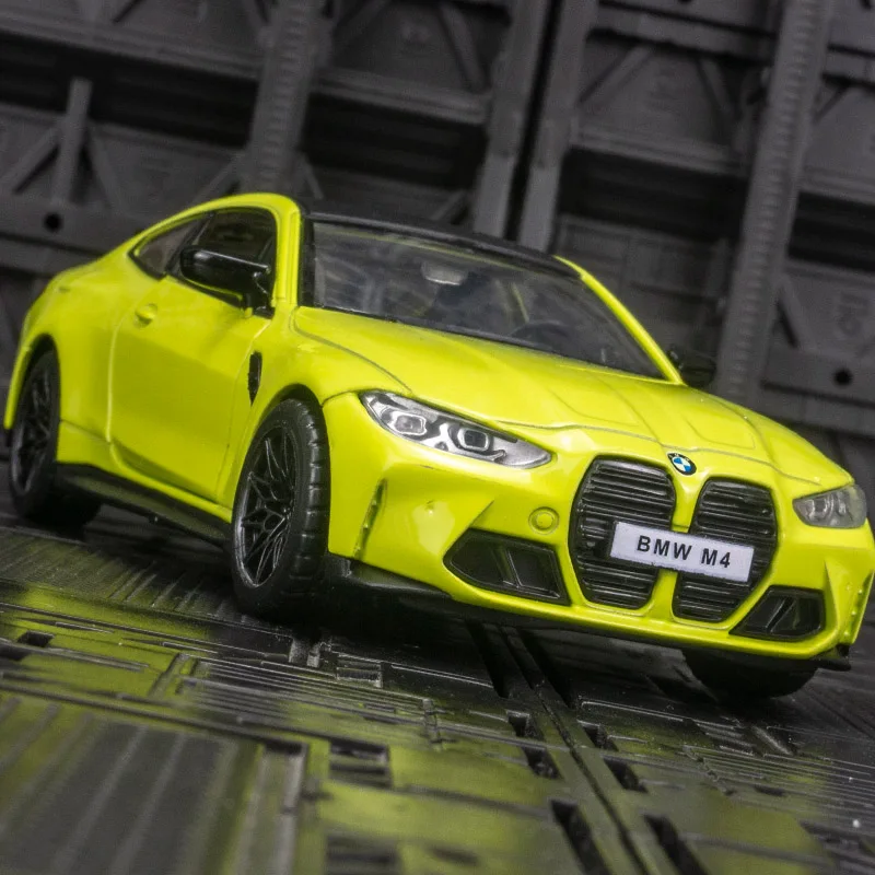 Step into the world of automotive passion with this highly detailed 1:32 scale BMW M4 G82 alloy diecast model. Crafted from durable alloy and plastic materials, this model captures the sporty essence of the original M4 G82 with an eye-catching bright yellow finish that immediately draws attention. The sleek, aerodynamic silhouette is accentuated by sculpted lines, a glossy black kidney grille with detailed ridges, and clear lens headlamps with intricate internal lighting, reflecting real automotive design. The black side mirrors and multi-spoke matte wheels complete its aggressive look. Perfect for collectors or enthusiasts, this model offers realistic detailing and a dynamic appearance that brings any space to life.