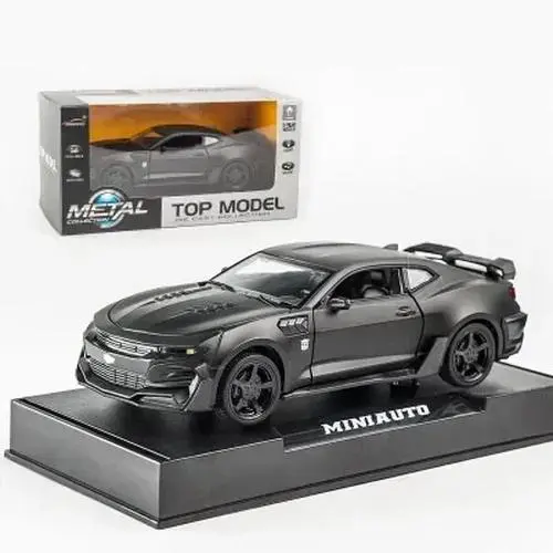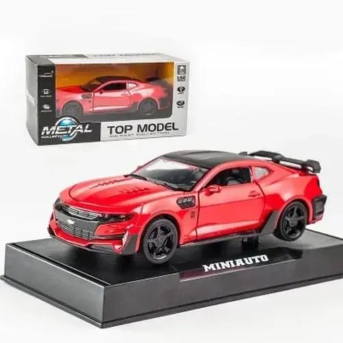 This vibrant yellow 1:32 scale diecast Chevrolet Camaro captures the essence of modern muscle cars with its sleek design, aerodynamic lines, and striking black accents. Measuring 16 cm long, 6.5 cm wide, and 4.6 cm high, it features detailed engine and interior components visible through openable doors, trunk, and hood. Built from durable zinc alloy and ABS plastic, it has four rubber tires with intricate rims and sharp headlights with a black grille featuring a gold Chevrolet emblem. The model includes functional doors, trunk, and hood, plus built-in lighting and sound effects activated by a push-back mechanism, providing an engaging display piece for enthusiasts.