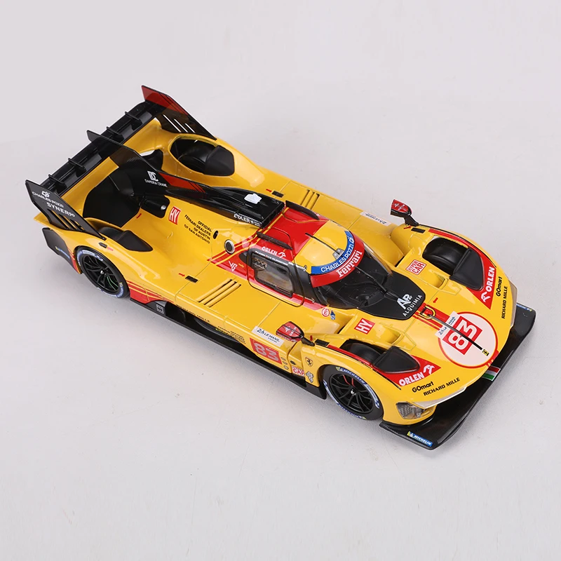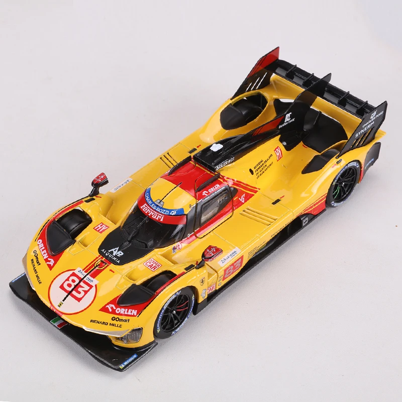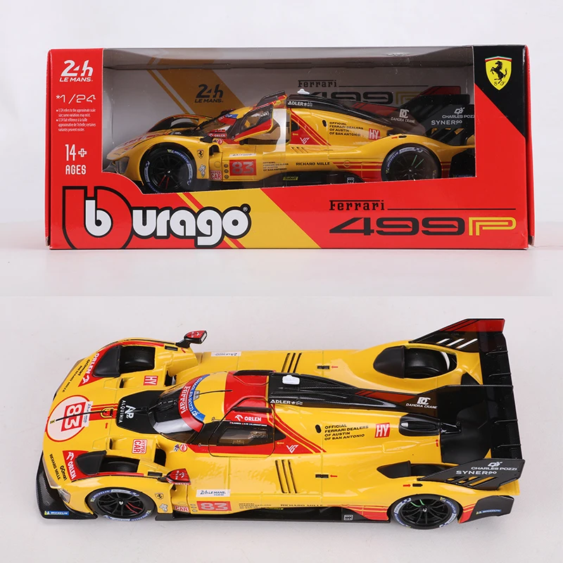 Step into the world of high-speed racing with this stunning diecast model of the Ferrari 499p Le Mans 24-hour Endurance Race Car No. 83 by Burago. Carefully crafted with meticulous attention to detail, this 1:24 scale replica captures the sleek, aerodynamic silhouette and vibrant yellow paintwork, accented with striking red racing livery and sponsor logos. The realistic design features integrated headlights with transparent covers, a bold black front splitter, subtle hood vents, and a clear windshield with black trim. A prominent rear wing and side air intakes complete its authentic race-inspired look. Ideal for collectors ages 14 and older, this model allows you to relive the thrill of endurance racing in your own collection.