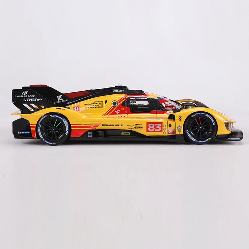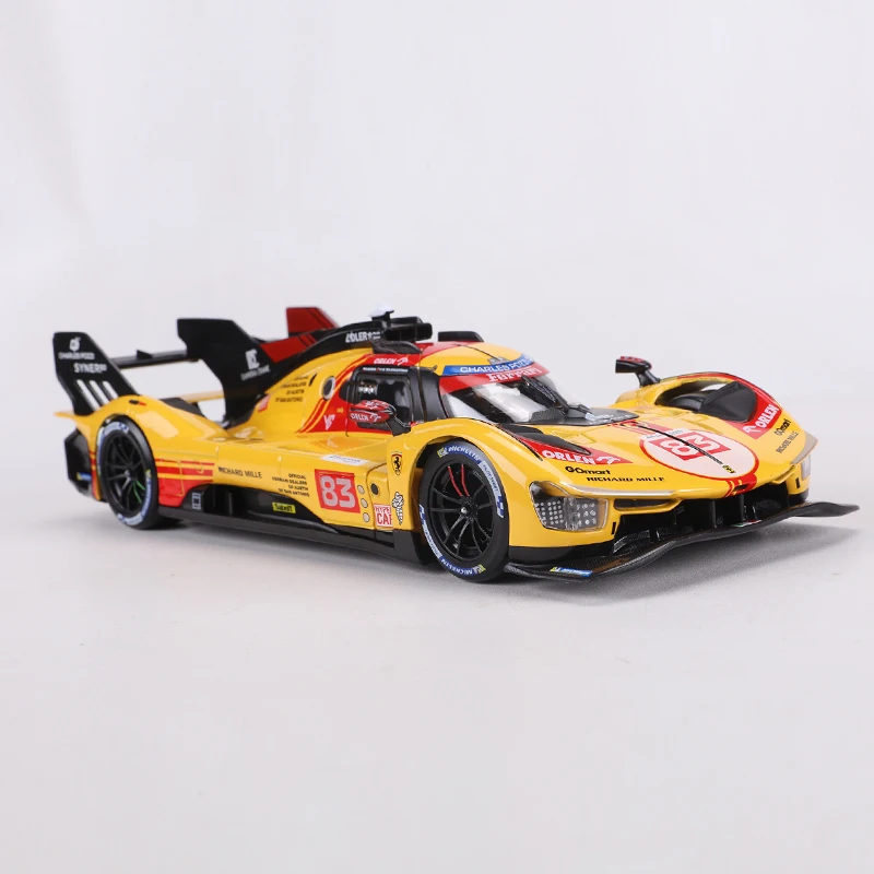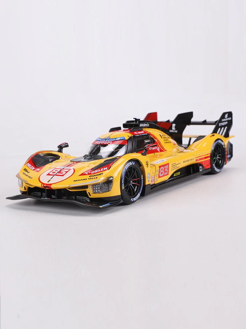 - Bright yellow body with vivid red accents, sponsor logos, and numbered 83 decal, showcasing its race-specific liveries and branding elements.