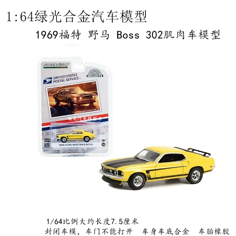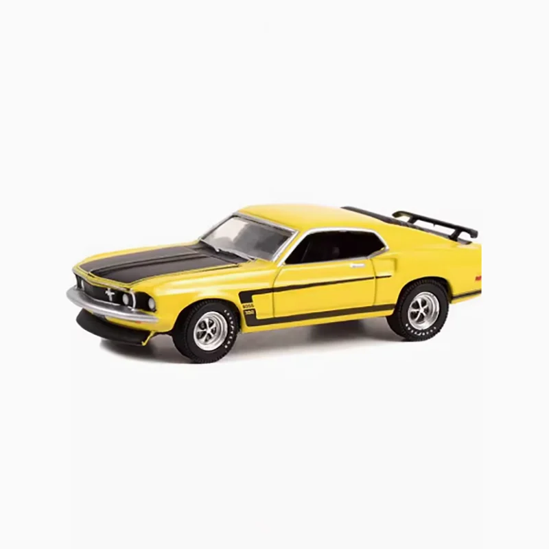 - Technical specifications include a scale of 1/64, construction from durable alloy, finished product, with measurements proportionate to the actual vintage Mustang BOSS models.