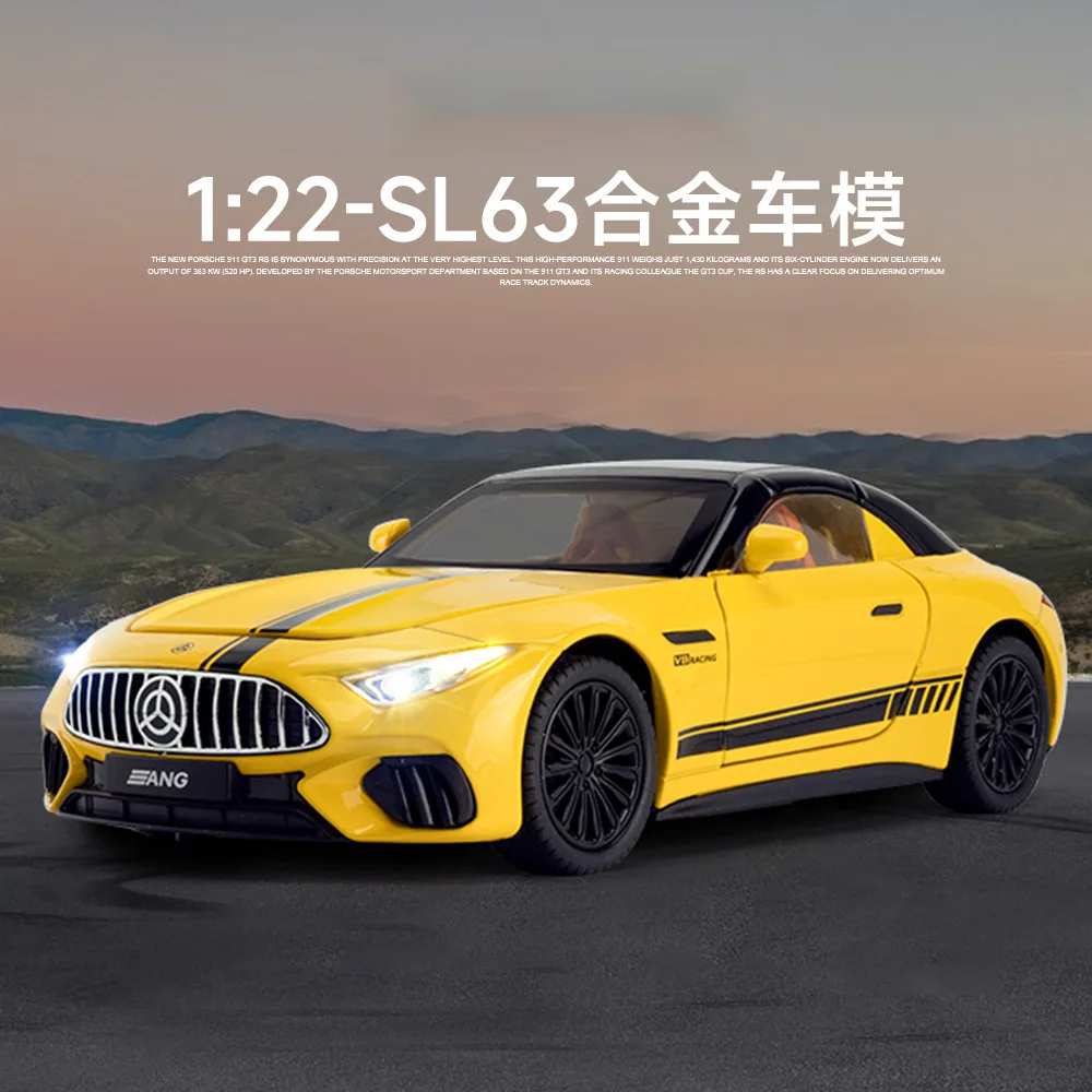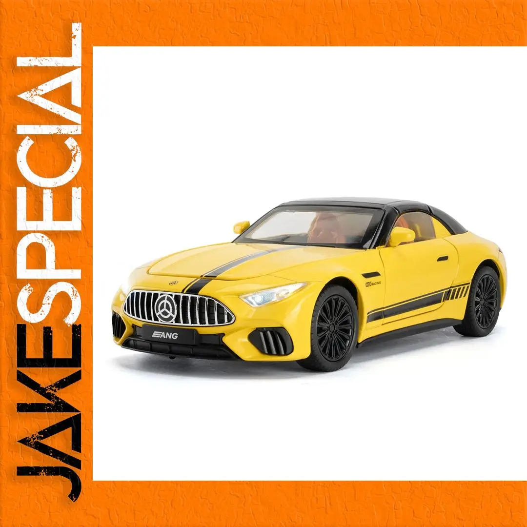 Imagine adding a stunningly realistic replica of the Mercedes-Benz SL63 to your collection. This model, crafted in a vibrant yellow hue, features a sleek black racing stripe along the hood and sides, accentuating its sporty character. The glossy black roof provides a sophisticated contrast, enhancing the two-tone aesthetic. With detailed transparent windows, you can appreciate the intricately designed interior, including seats and dashboard, adding depth and authenticity. Measuring approximately 20 centimeters long, this 1:24 scale model combines durability with fine craftsmanship. Its metallic finish, textured rubber tires, and polished alloy-style wheels create a lifelike appearance. Light and sound features powered by batteries bring this collectible to life, perfect for display and admiration.