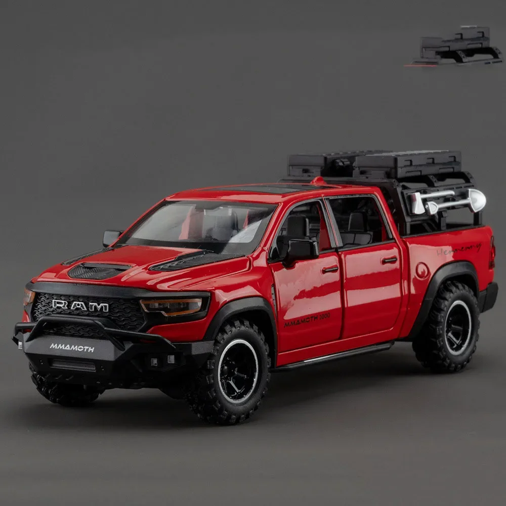 - Features textured front grille with RAM branding, vented hood, clear molded headlamps, detailed interior visible through transparent windows, and a functional cargo rack on top for a rugged look.