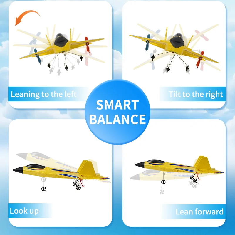 Experience the thrill of flying this vibrant yellow fighter jet-inspired RC plane that combines sleek design, durable materials, and advanced tech features. Its aerodynamic silhouette features high, angular vertical stabilizers and broad, slightly backward-swept wings decorated with patriotic red, blue, and white graphics, including stars and stripes. The black nose provides a striking contrast, adding to its sporty appeal. Equipped with multicolored LED lights on the top and underside, it dazzles during night flights, making every flight memorable. Built with lightweight yet resilient EPP foam and stainless steel wire landing gear, this plane offers excellent durability and performance. Whether you're an enthusiast or a beginner, this model guarantees fun, stability, and a sense of achievement with each flight. Imagine yourself controlling it effortlessly, enjoying the vibrant lights and swift maneuvers across the sky.