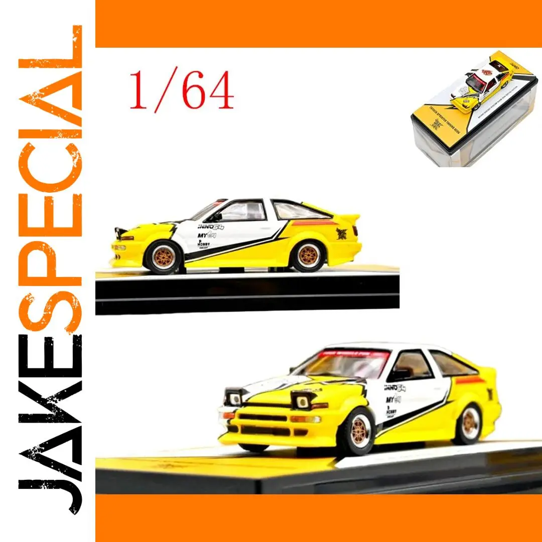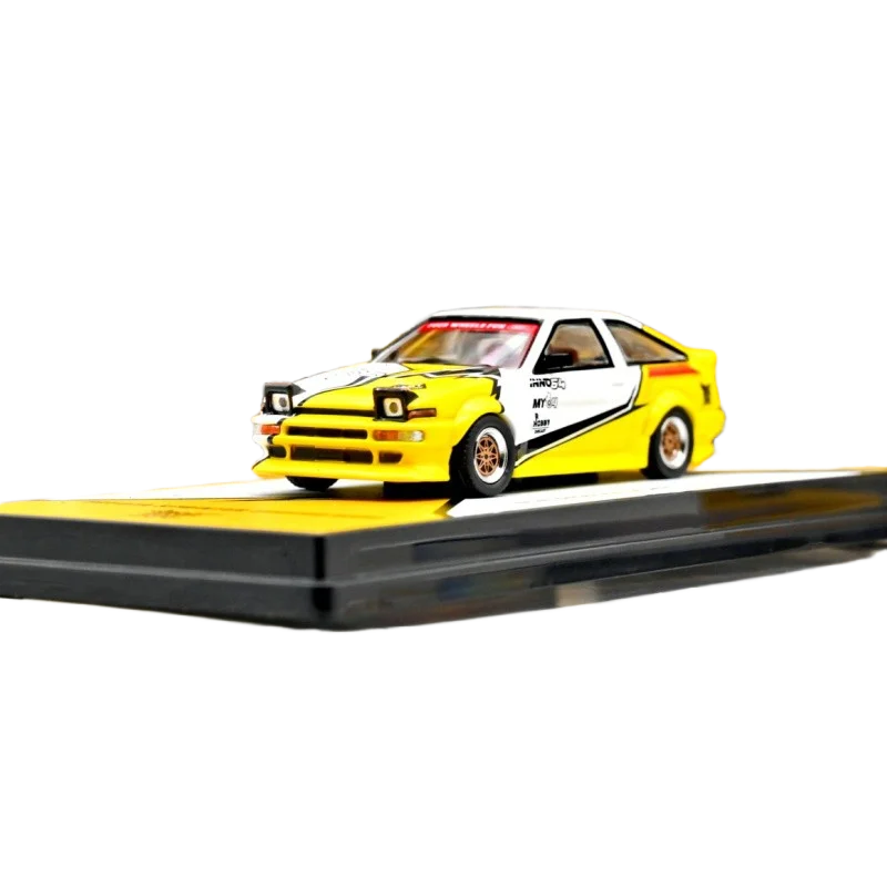 Step into the world of collectible diecast cars with this stunning 1/64 scale Toyota AE86 Sprinter Trueno. Crafted with meticulous attention to detail, this alloy model captures the sporty elegance of the original vehicle, featuring a vibrant yellow body contrasted by white, black, and red accents. Its sleek design showcases rectangular headlights, with an open left headlight and a closed right, along with a wide front bumper highlighted by black detailing. Side decals in black and red add an authentic racing feel, while transparent windows reveal a finely detailed interior. The orange mesh-pattern wheels with black rubber tires enhance its realism. Perfect for display, this model also makes an impressive gift for car enthusiasts.