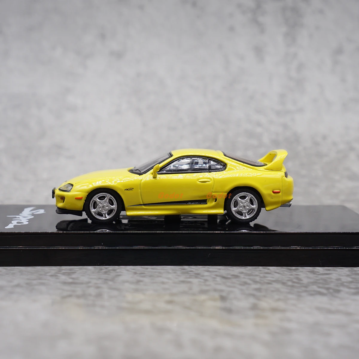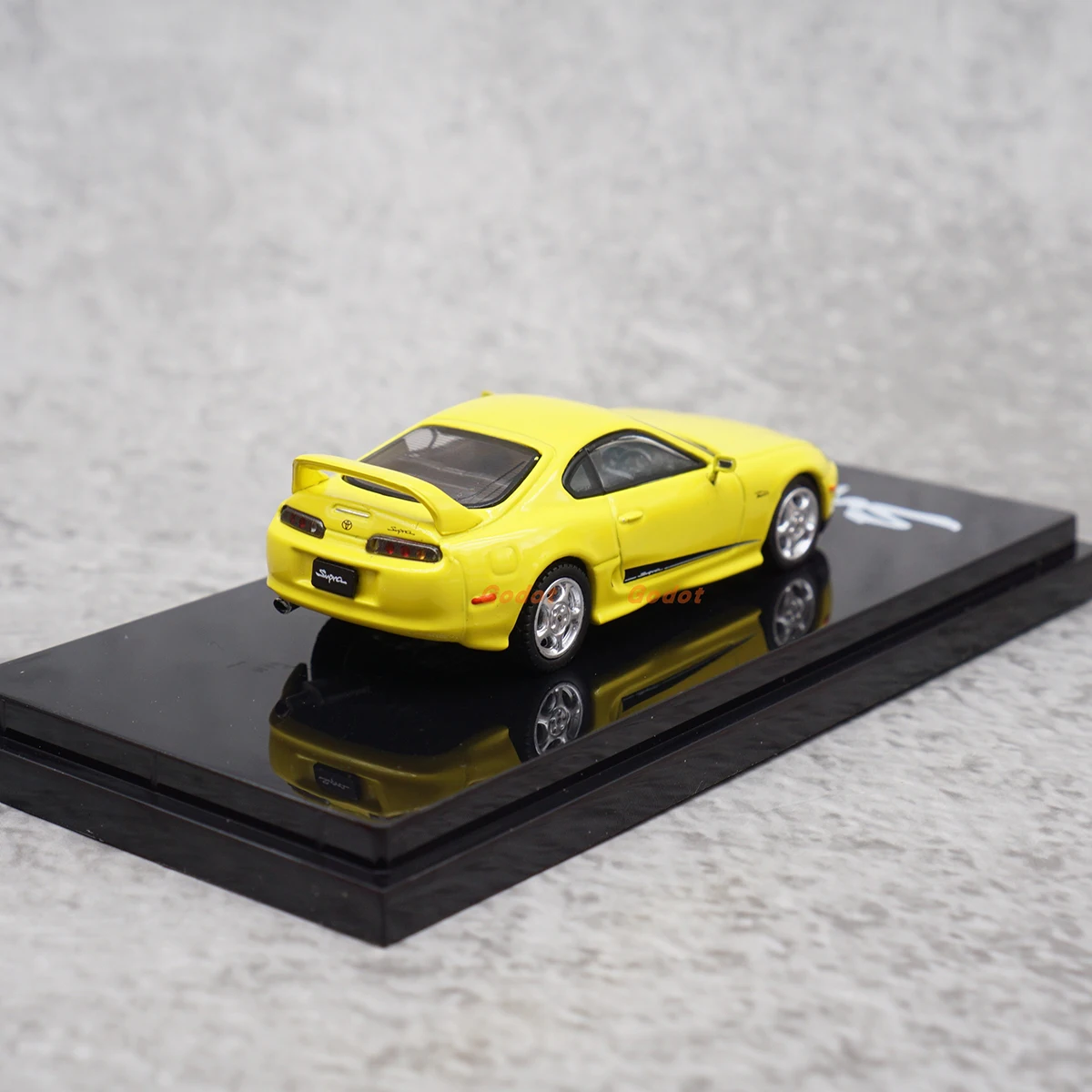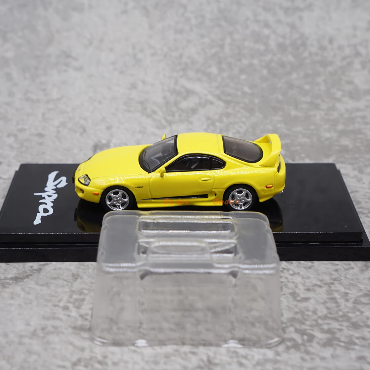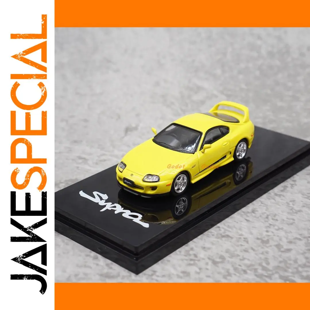 - Authentic 1:64 scale diecast model with a vibrant yellow metallic finish, capturing the sporty appeal of the Toyota Supra A80 with high attention to detail and realism.
