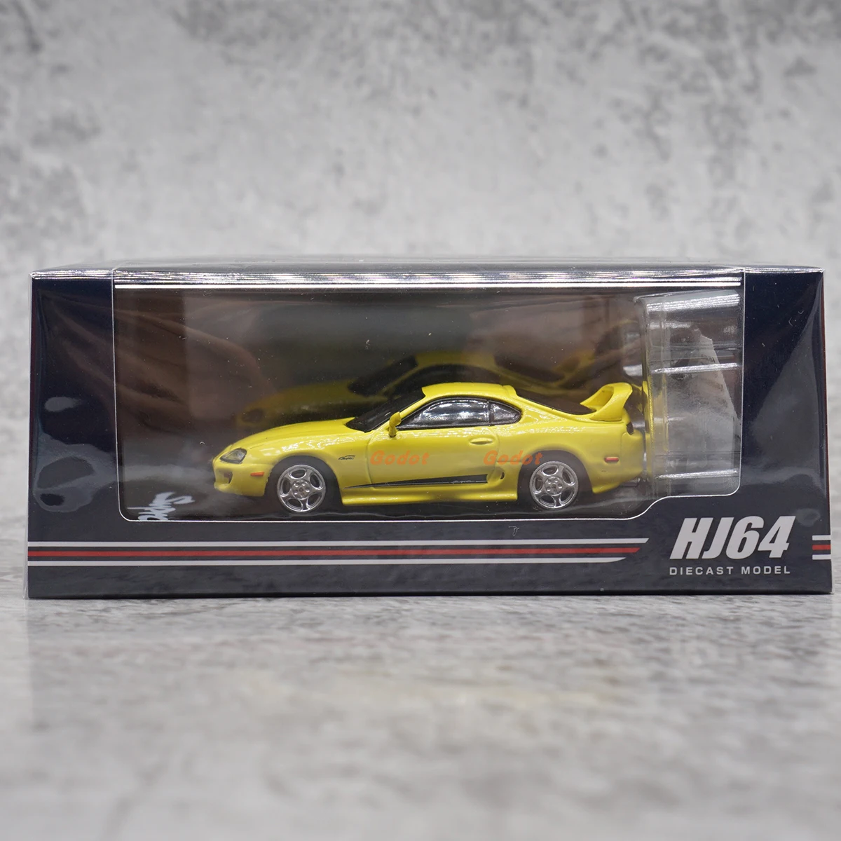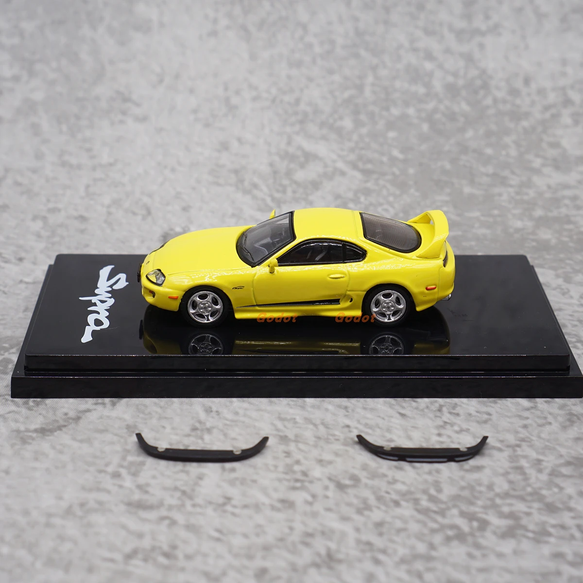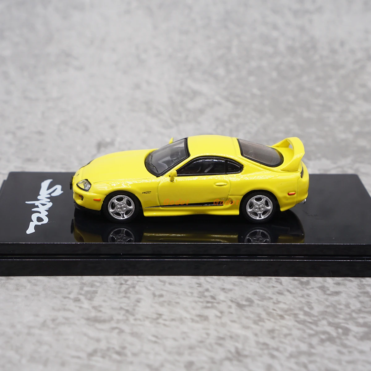 - Authentic 1:64 scale diecast model with a vibrant yellow metallic finish, capturing the sporty appeal of the Toyota Supra A80 with high attention to detail and realism.