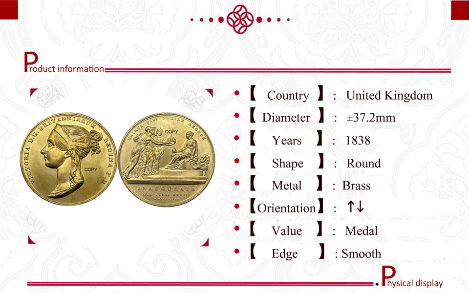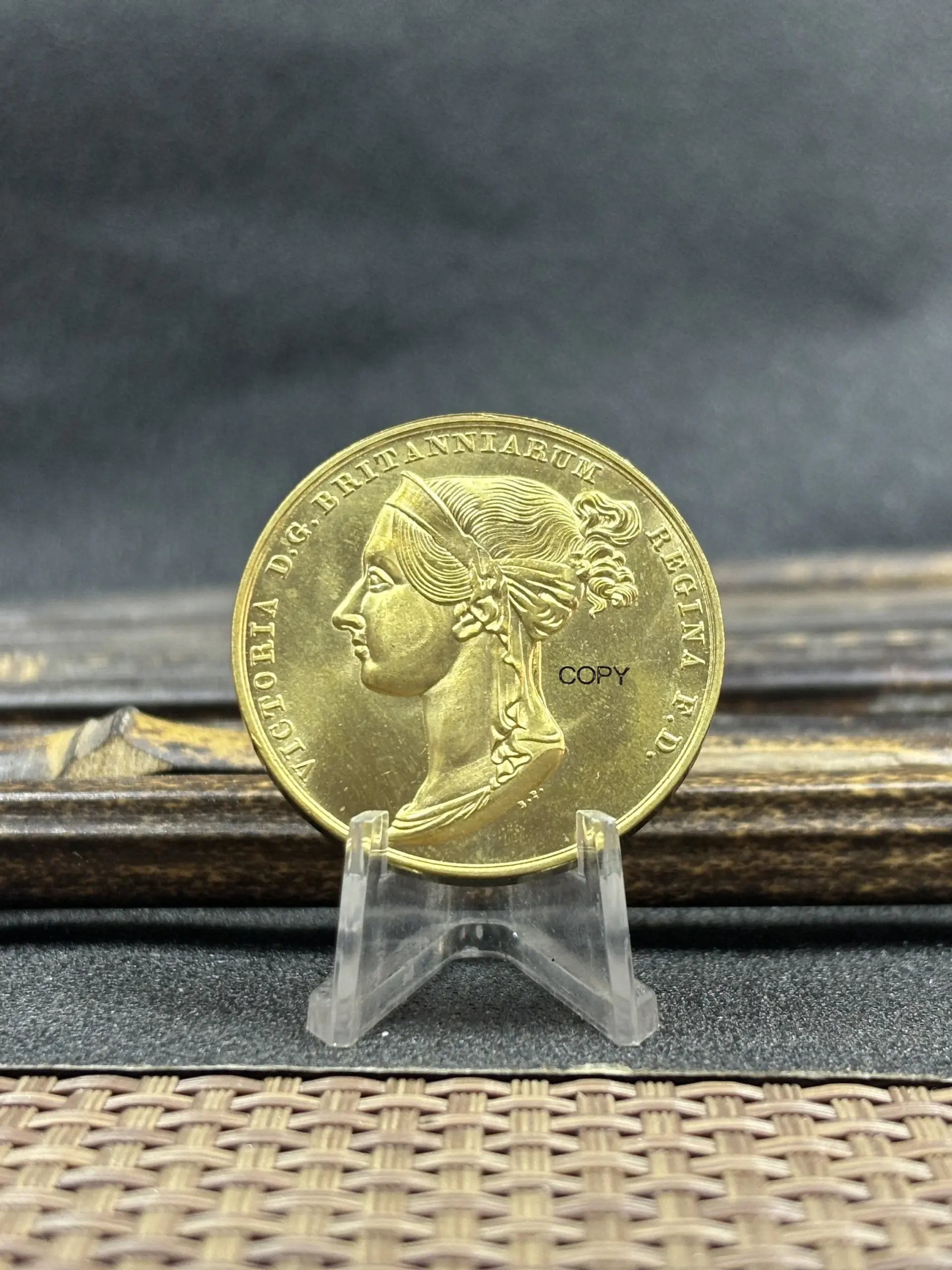 Enhance your collection with this 40mm diameter replica medal featuring Queen Victoria’s profile facing left, adorned with intricately curled hair, a decorated ribbon, and a jeweled diadem. Crafted from durable metal with a shiny, reflective antique finish, it authentically mimics vintage medals, highlighting detailed relief work and crisp inscriptions—including “VICTORIA G. BRITANNIARUM REGINA.” Designed for display, gifting, or personal collection, this medal combines historical elegance with modern craftsmanship, ensuring lasting beauty and a timeless regal appeal. Customizable options are available for color adjustments and bulk orders, making it a perfect addition for history enthusiasts and collectors alike.