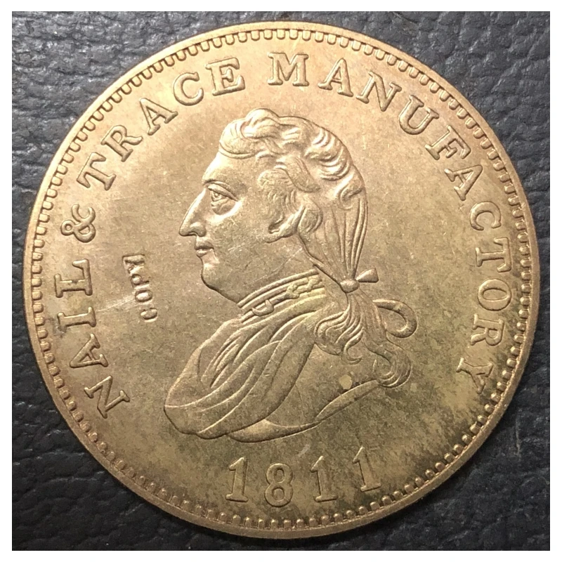 Experience the charm of 19th-century European craftsmanship with this beautifully crafted replica of an 1811 British penny. Made from durable copper using casting techniques, this coin boasts a rich, vintage appearance with an aged, antique patina that evokes a sense of history. The detailed profile depicts a regal figure with wavy hair tied back with a ribbon, adorned in traditional attire, complemented by ornate European script around the edges. The coin measures approximately 20-25 mm in diameter, with a series of evenly spaced ridges along the border that enhance its finished look. Whether you're a collector or a history enthusiast, this piece adds an elegant, nostalgic touch to any collection, showcasing intricate craftsmanship with a warm metallic sheen.
