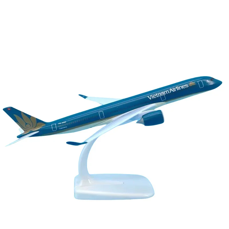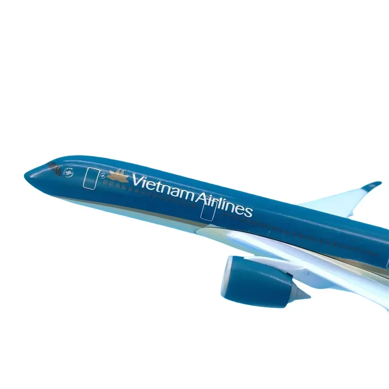 This stunning Airbus A350 model, measuring 20 cm, features a vibrant blue design with a smooth gradient that elegantly transitions towards lighter shades on the wings and tail. Crafted from a premium combination of alloy and resin, this collectible includes intricately detailed landing gear and is mounted on a contrasting white display base. The fuselage showcases the Vietnam Airlines logo with a stylized golden lotus flower for added sophistication. Some assembly may be required for the wings and wheels, and while minor paint stripping may occur, this only enhances its authentic charm. Caution is advised due to sharp parts.