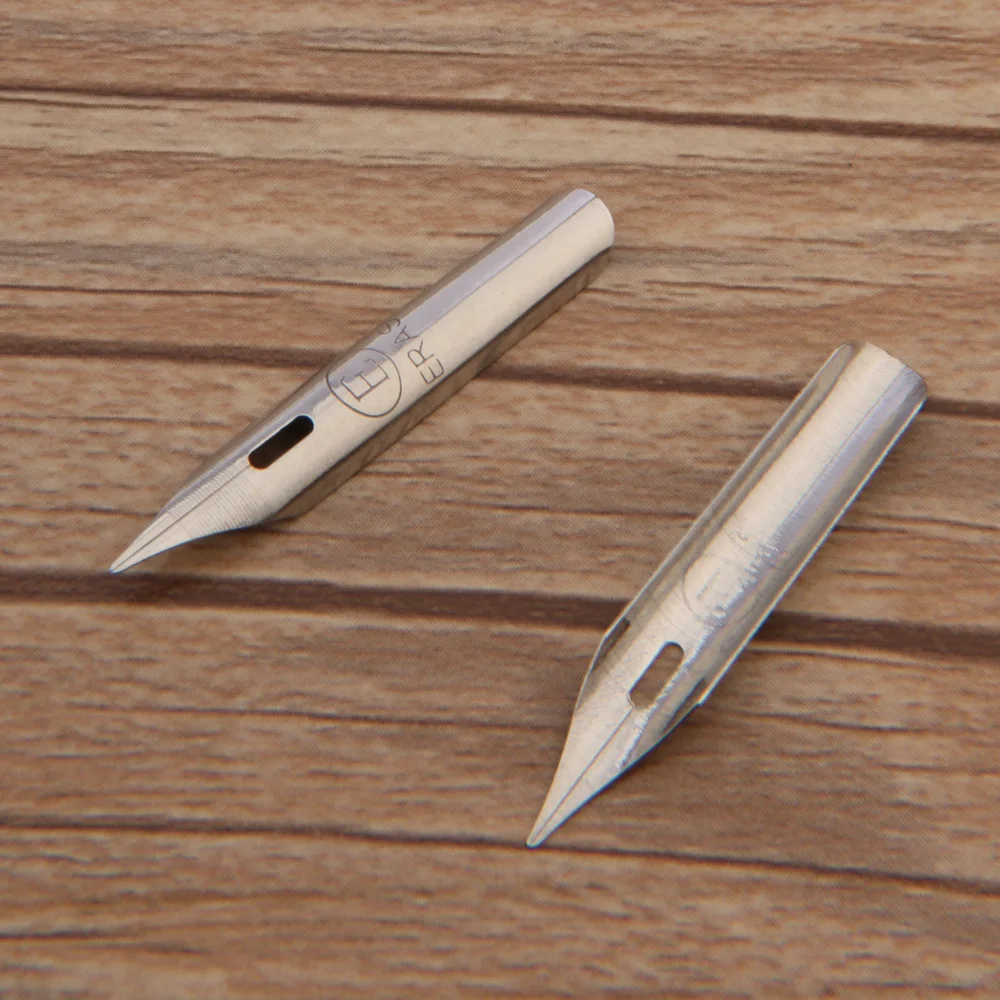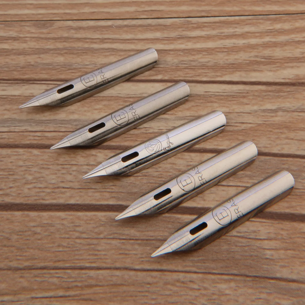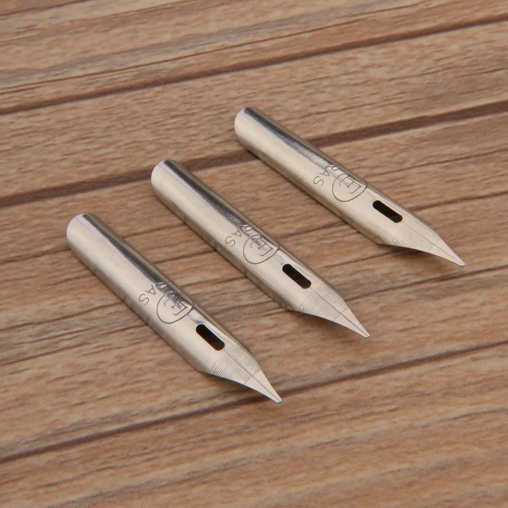 Experience the refined craftsmanship of this set of three hand-polished stainless steel dip ink nibs, specially designed for water-based ink applications. With a sleek, polished metallic silver finish, these nibs reflect light beautifully and exude durability and elegance. Each nib features a sharp, tapered tip perfect for detailed writing or cartoon sketches, coupled with a finely engraved marking, including a prominent “E” in a circle. Their elongated bodies and textured ridges near the grip section provide a comfortable handling experience, enabling precision in every stroke. Whether you're creating intricate text or artistic illustrations, these Vietnam-style nibs offer both aesthetic appeal and functional excellence, elevating your water-based ink writing projects with craftsmanship and style.