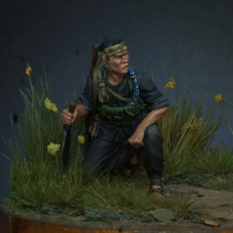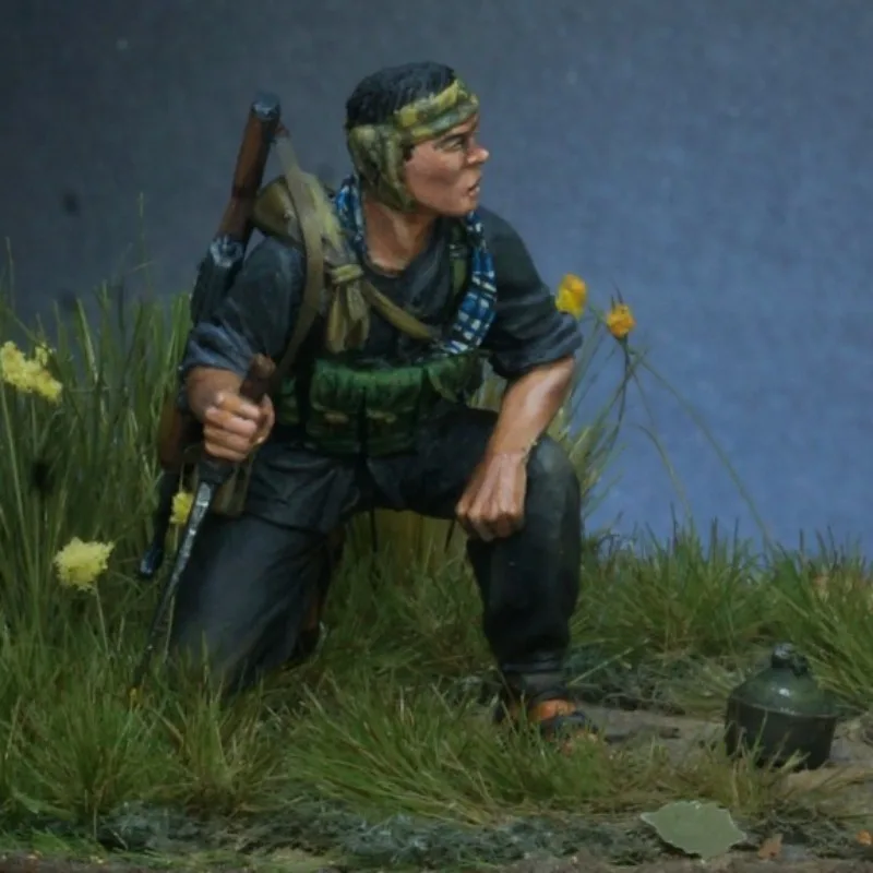 Bring your military hobby collection to life with this highly detailed 1/35 scale resin figure model kit representing Vietnam War militia. Designed for adult hobbyists, this unassembled, unpainted gray miniature features a realistic crouching soldier with expressive facial features, detailed clothing with weathered textures, a camouflage bandana, tactical strap, machete, and a backpack, all set on a natural terrain base with grass tufts and small rocks. Made from durable resin and suitable for display, this static figure offers an immersive, rugged aesthetic capturing the survivalist spirit of the Vietnam era. Ideal for crafting, painting, and diorama projects.