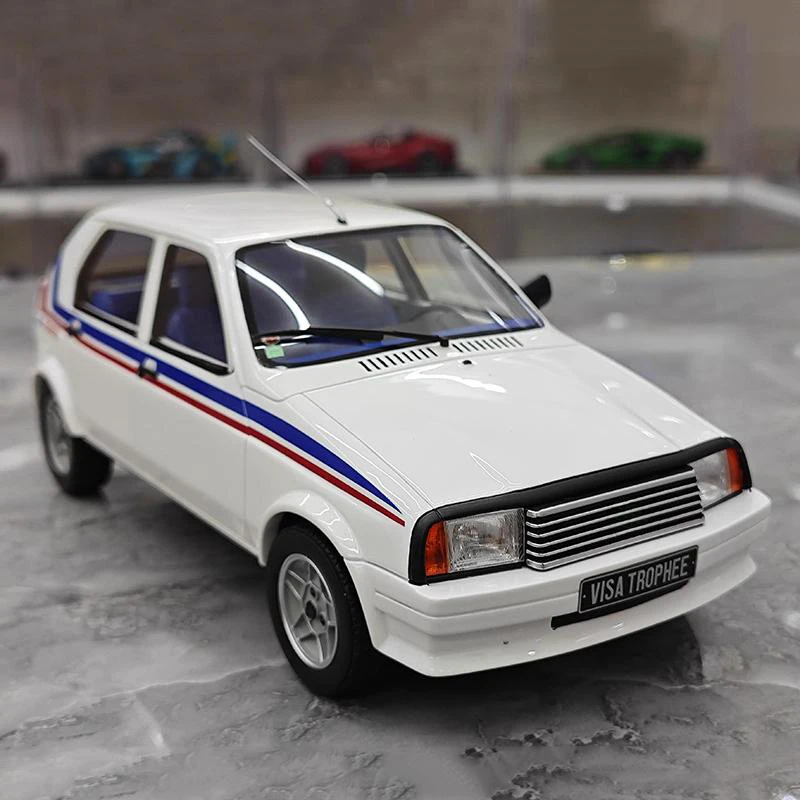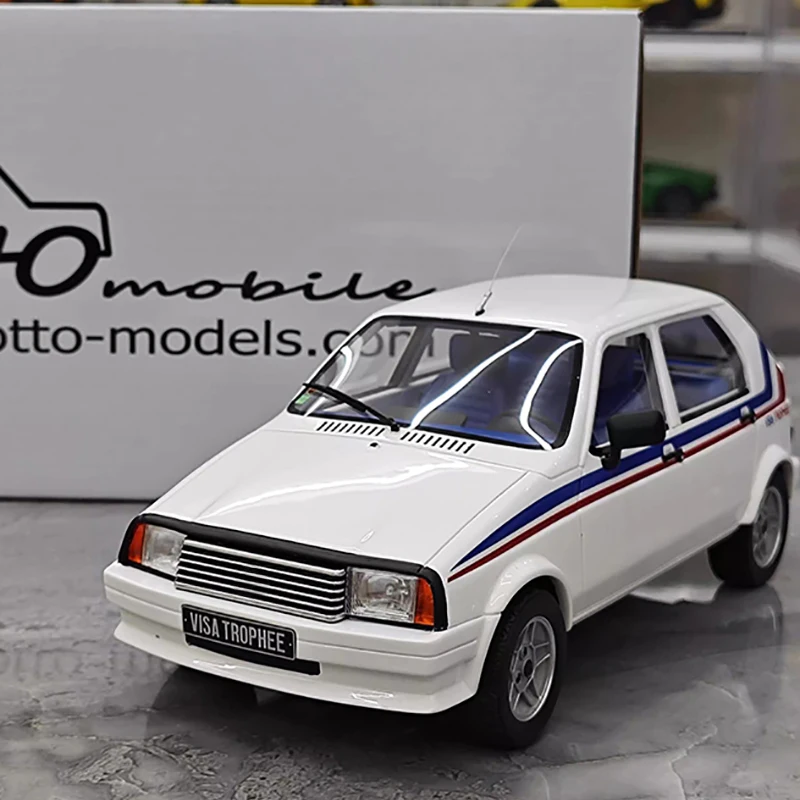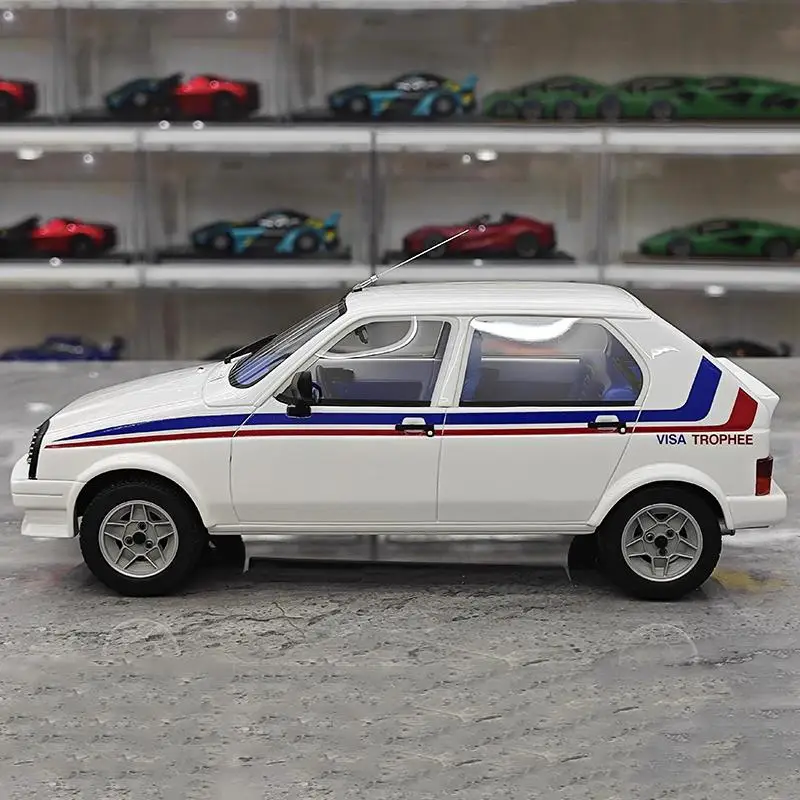 Immerse yourself in the thrilling world of vintage racing with this meticulously crafted OTTO resin scale model of the VISA TROPHEE GR. B from 1983. Measuring approximately 26 cm long, 10 cm wide, and 8 cm high, this 1:18 scale replica captures every detail, from the sleek white bodywork to the bold rally-inspired blue and red diagonal stripes. Designed for enthusiasts and collectors, the model showcases sharp-edged contours, a wide black grille with horizontal slats, and realistic silver alloy rims on black tires. Its transparent windows reveal glimpses of the interior, adding to its authentic appeal. Whether displayed in your collection or adding a touch of racing history to your space, this model invites admiration and pride in your collection.