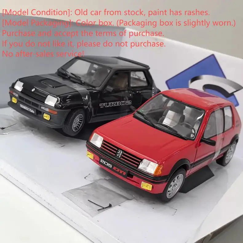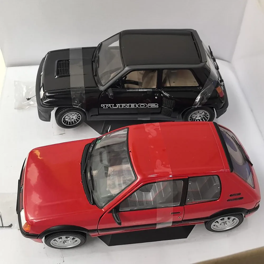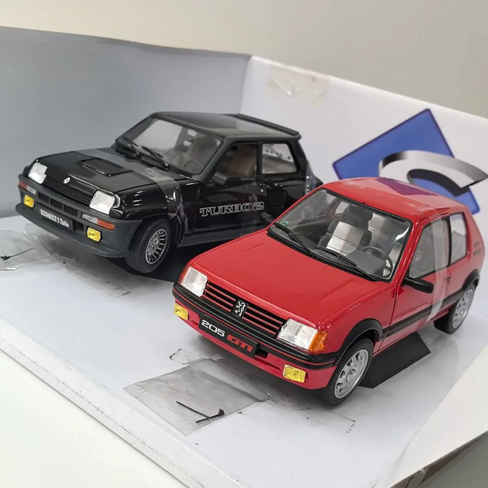 This vintage 1:18 scale collectible features a detailed alloy model of a Peugeot 205 GTI and Renault R5 TURBO, crafted from alloy, plastic, and rubber. It offers realistic features such as opening doors and front-wheel steering, making it an ideal display piece for collectors and enthusiasts. The models showcase vibrant color schemes— a striking red Peugeot and a sleek black Renault with “TURBO” decals—highlighting their sporty design and detailed craftsmanship. Slight imperfections like paint rashes and minor packaging wear reflect its vintage nature, adding to its unique charm. Perfect for decoration, gift-giving, or building a nostalgic collection, it’s a must-have for car model aficionados.