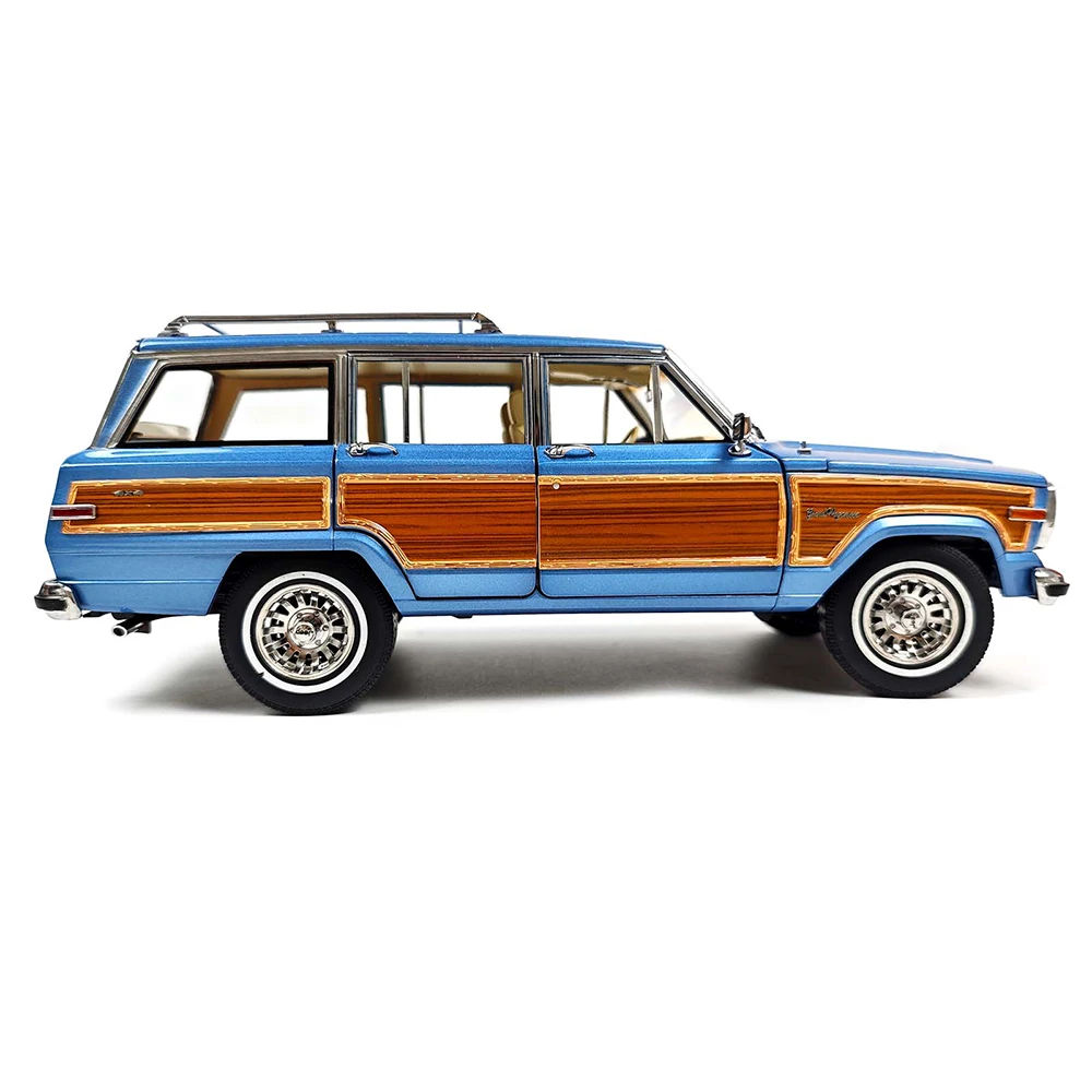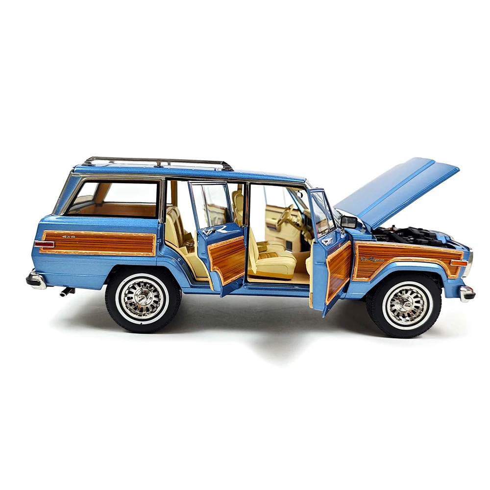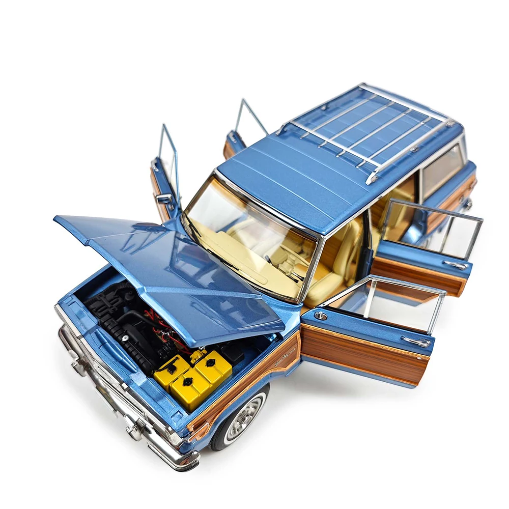 Imagine owning a beautifully crafted scale replica of a vintage Wagoneer, designed to captivate collectors and enthusiasts alike. Measuring 1:18 scale, this model boasts vibrant blue color accented by faux wood paneling, evoking classic, retro SUV styling. The front features a chrome grille with horizontal slats, rectangular headlights, and a shiny chrome bumper, emphasizing authentic details. Sides include silver side mirrors and chrome door handles, with realistic rubber tires sporting whitewalls and silver hubcaps. The transparent windows reveal a beige interior with detailed seats and dashboard. Functional elements like opening doors and hood enhance display realism. Made from durable alloy, rubber, and ABS, it’s perfect for decorating, gifting, or appreciating vintage automotive design.