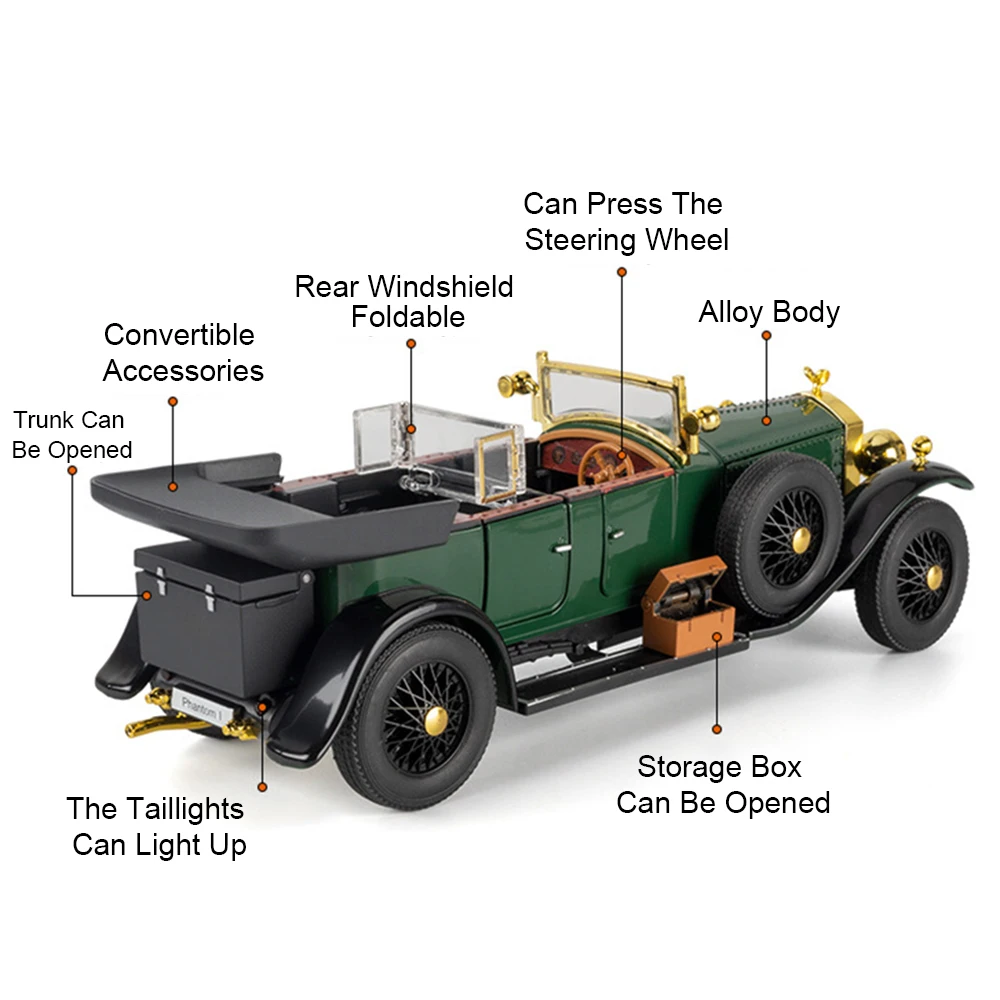 Experience the timeless elegance of this meticulously crafted 1:24 scale diecast car, designed to captivate adult collectors and auto enthusiasts alike. Available in striking colors like Phantom Black, Phantom Green, Purple, Silver, and vibrant Red, each model showcases a glossy metal body with detailed finishings that highlight vintage automotive design. The cars feature openable doors, realistic rubber tires, and functional sound and light effects, adding an immersive touch. With a pull-back mechanism, these models combine durability with nostalgic charm. Their compact size—about 22 cm long—makes them ideal displays or collectibles, perfect for evoking the grandeur of early 20th-century luxury automobiles and enhancing your personal collection.