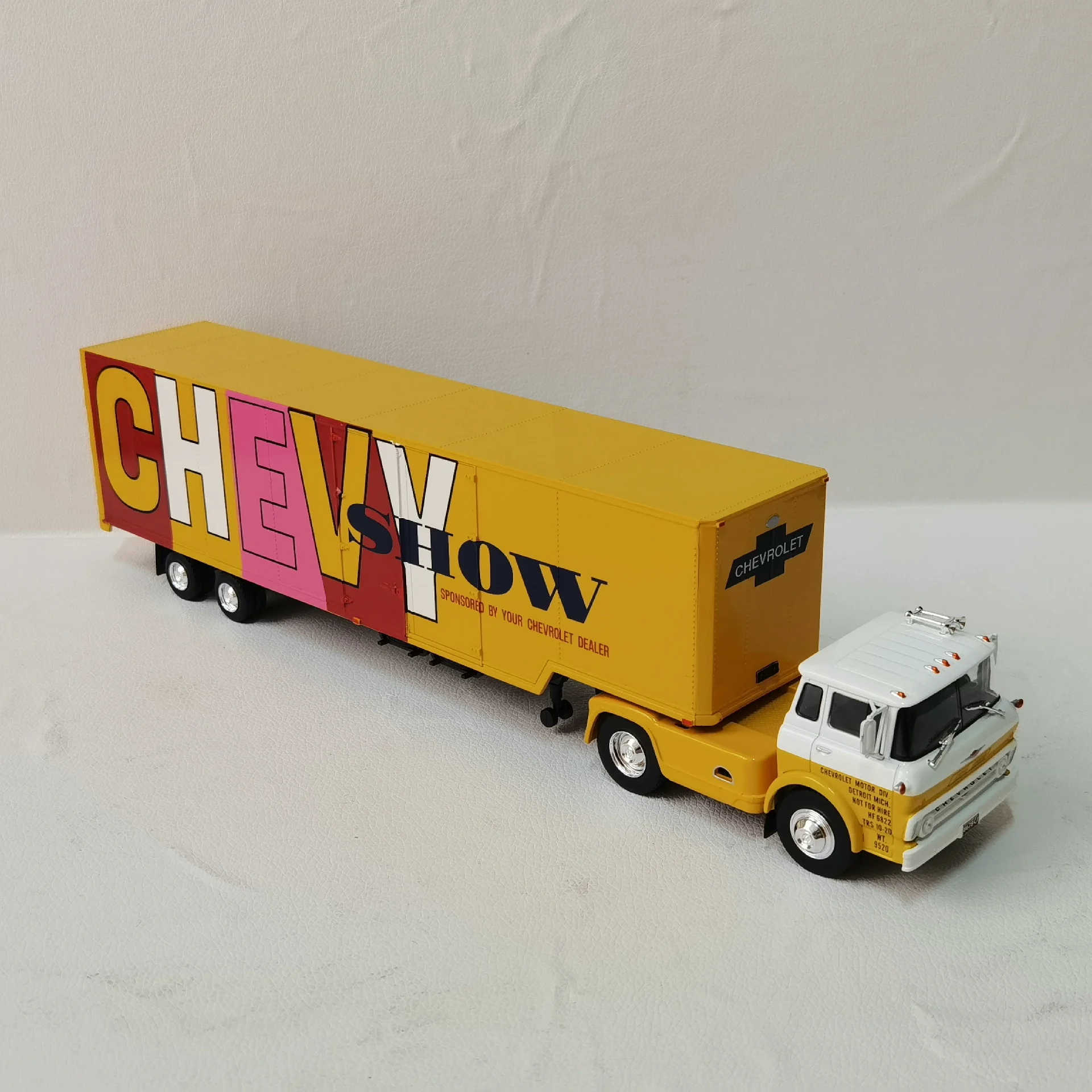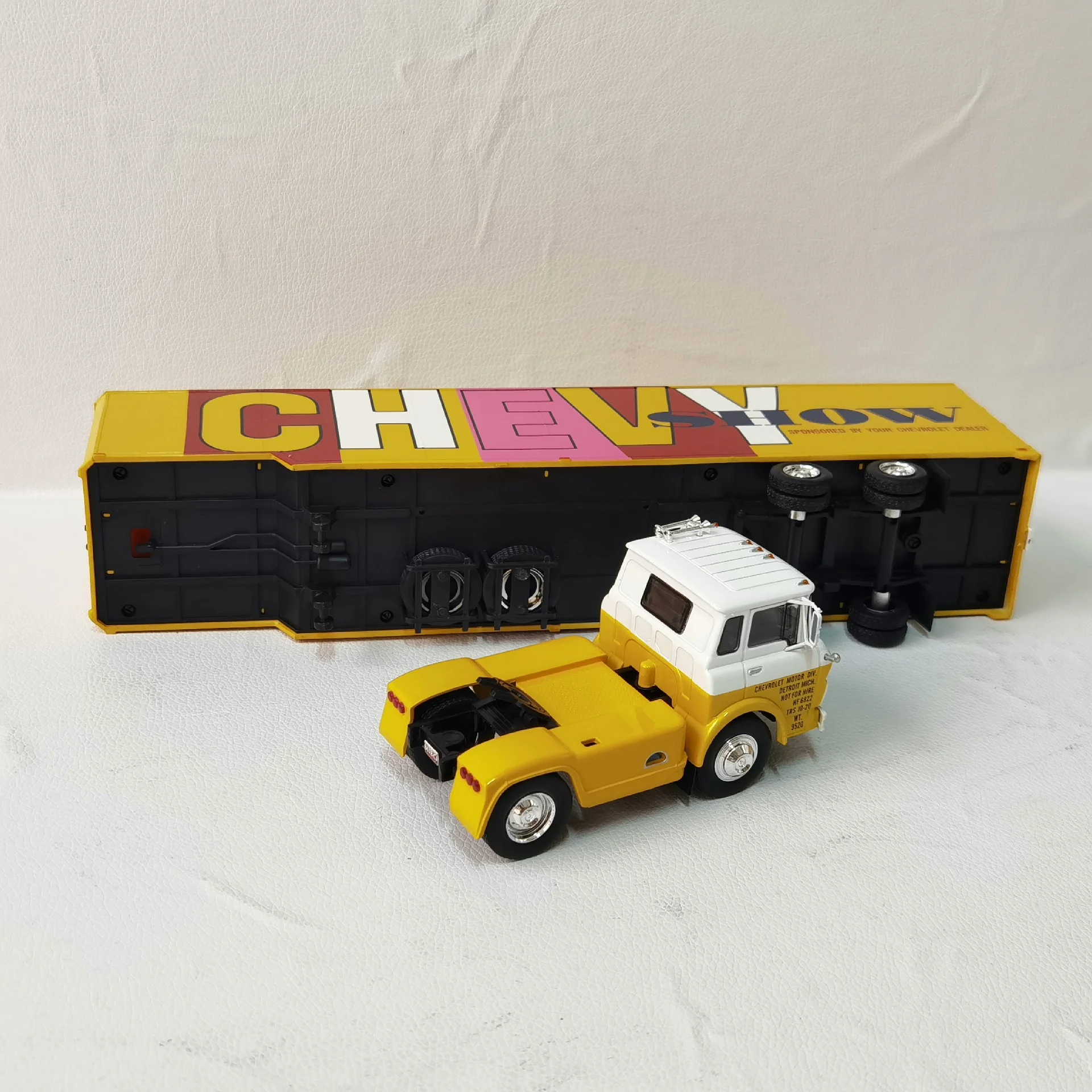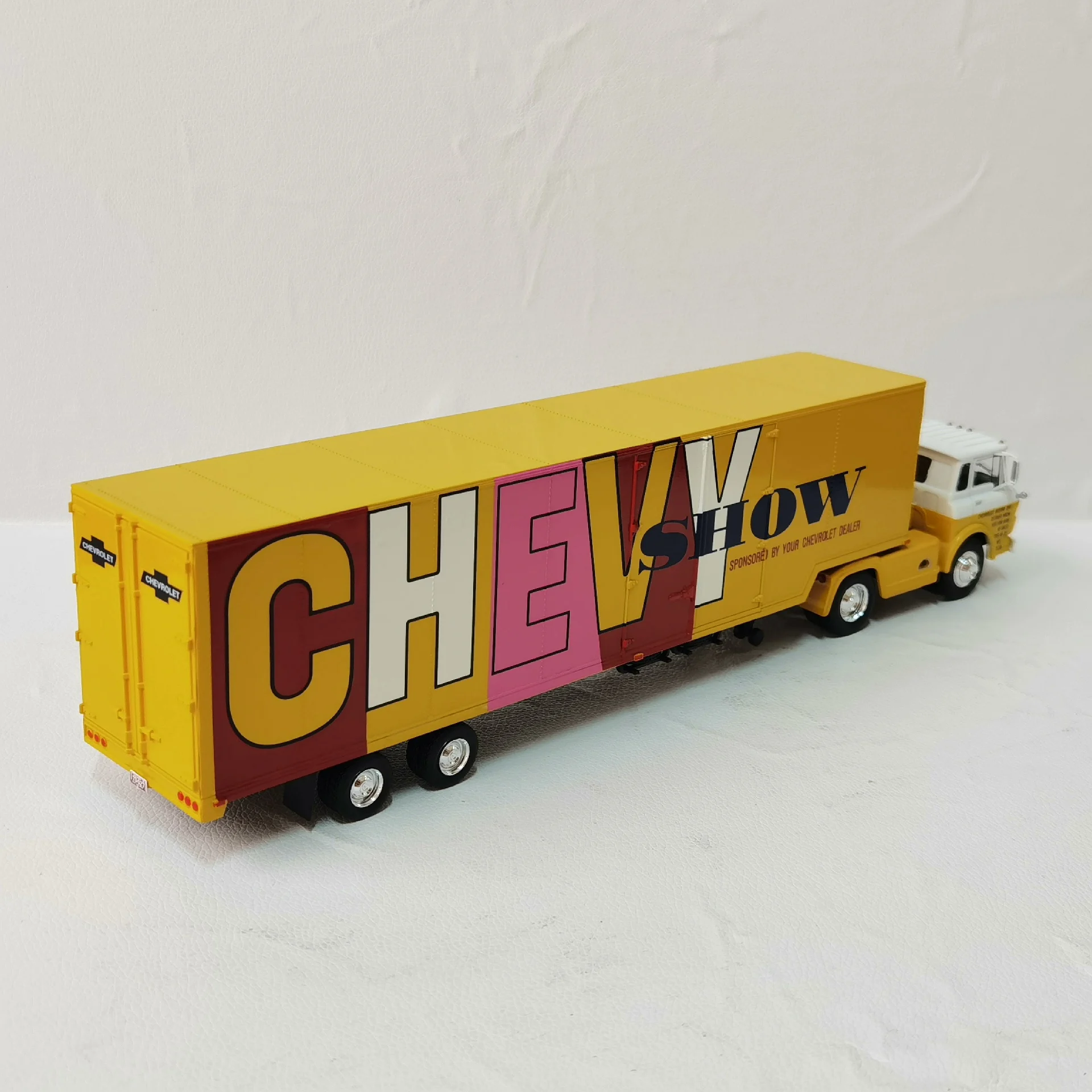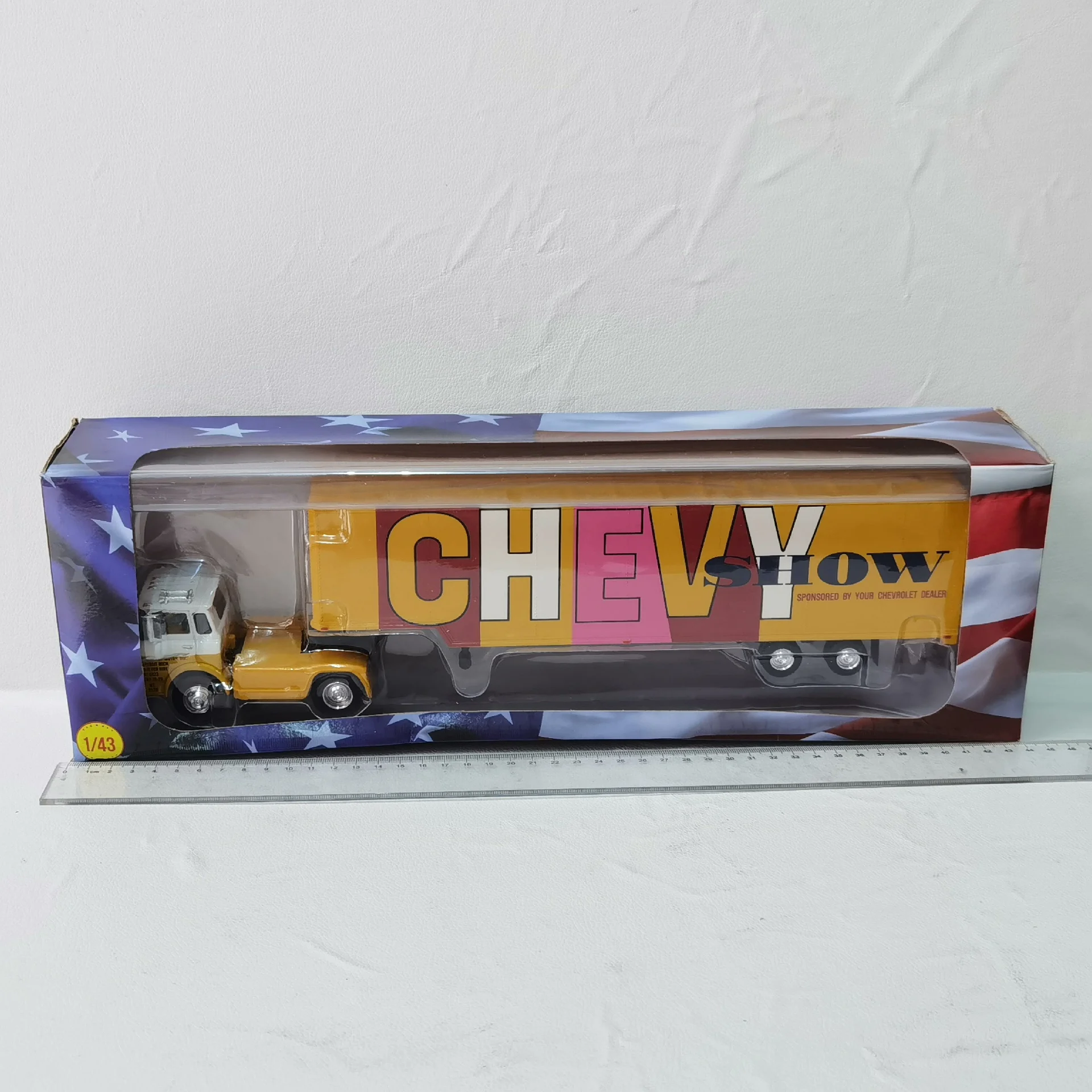 Imagine owning this meticulously crafted miniature transport truck that captures the charming nostalgia of vintage vehicles. Its alloy front cab, painted in a crisp white with a yellow base, features intricate black and red detailing reminiscent of classic Chevrolet trucks. The bright yellow plastic container boldly displays playful “CHEV SHOW” graphics in bold, multicolored comic-style fonts—reds, blacks, pinks, and whites—that instantly evoke a lively, retro vibe. With realistic silver wheels that turn smoothly and etched black window outlines, every detail is designed for collectible appreciation. Perfect for display, this model brings character and vibrant color to any collection, and its durable construction guarantees enjoyment for years to come.