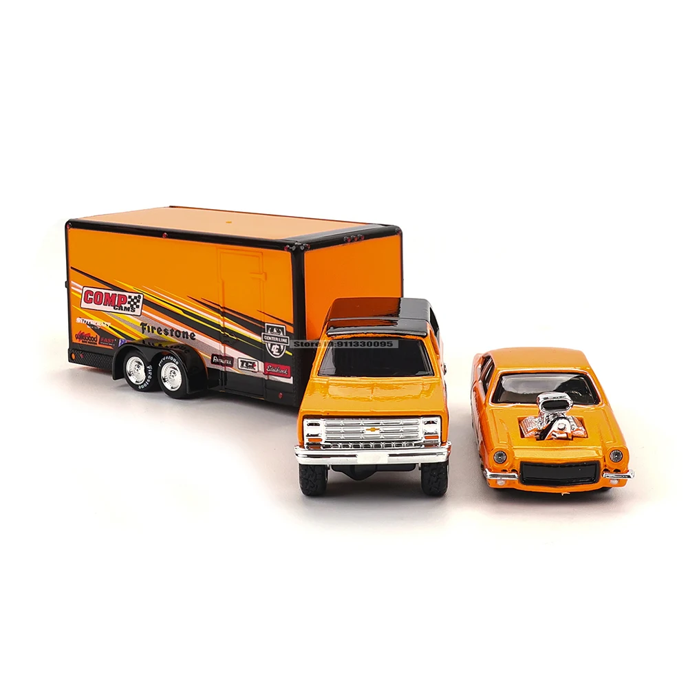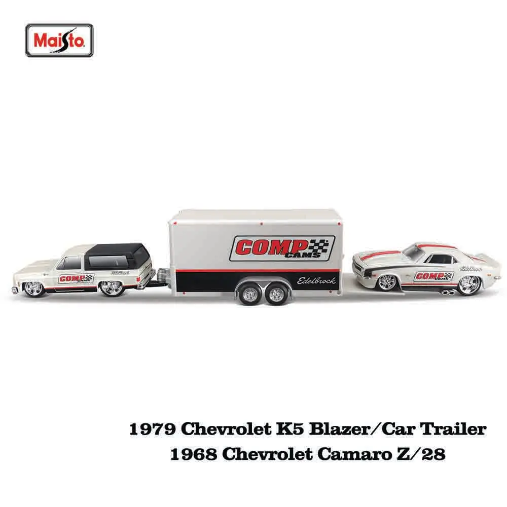 Step into the world of classic American cars with this detailed die-cast model set by Maisto. Crafted with precision, it showcases two iconic vehicles: the 1979 Chevrolet K5 Blazer and the 1971 Chevrolet Vega, both captured in bold orange hues. The models feature realistic design elements, including functional opening doors, rugged textured tires, and detailed front grilles and headlights. Accompanying these vehicles is a matching trailer with an authentic racing-themed decal layout, creating a lively, nostalgic aesthetic. The entire set is perfect for collectors and enthusiasts alike, offering an engaging display piece that embodies craftsmanship and vintage spirit. Compact yet intricately detailed, it transforms any collection with its vibrant colors and high-quality finish.
