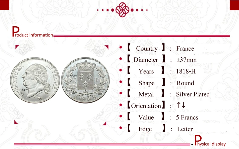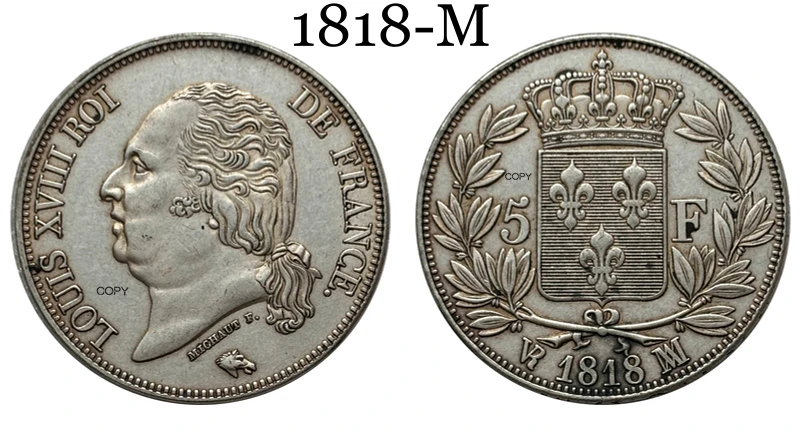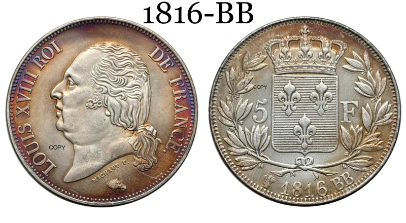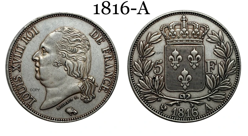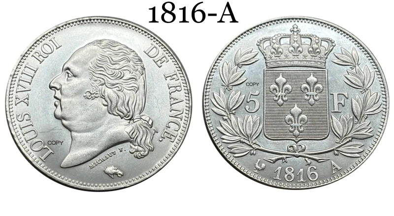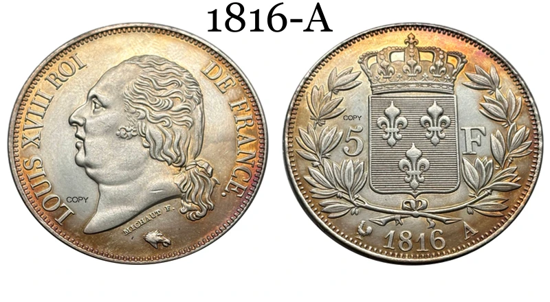 Elevate your collection with this detailed silver-plated replica commemorative coin inspired by the 5 Franc Louis XVIII series from France, minted between 1816 and 1818. Crafted with no chemical processing, it boasts an antique stylized design reminiscent of regional US coin features, with options in black, multi-color, and silver finishes. The coin features a polished, reflective surface, detailed engravings of Louis XVIII’s profile facing left, and a smooth, reeded edge. Perfect for collectors who appreciate historical artistry, this replica combines vintage aesthetics with customizable color choices to enhance any coin collection or display.