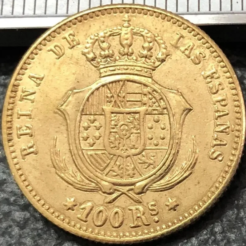 This intricately cast replica coin features the 1855 Spain 100 Reales-Isabel II gold coin design, crafted with a vintage European antique style from metal with an antique, worn appearance. Measuring in the period of 1840 to 1859, it showcases a detailed central shield divided into four quadrants adorned with heraldic emblems and topped with an ornate crown, surrounded by the inscription “REINA DE LAS ESPAÑAS” and the denomination “100 R$.” The coin’s textured surface and small dot border enhance its elegant, historical look, making it an ideal collector’s item for enthusiasts who appreciate detailed craftsmanship and heritage.