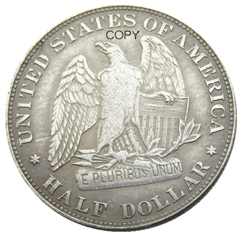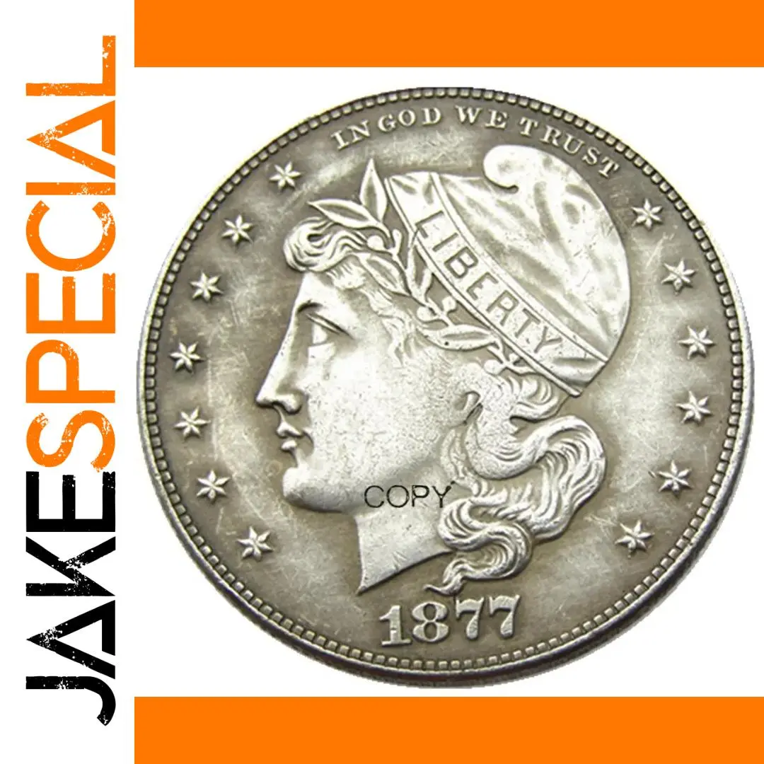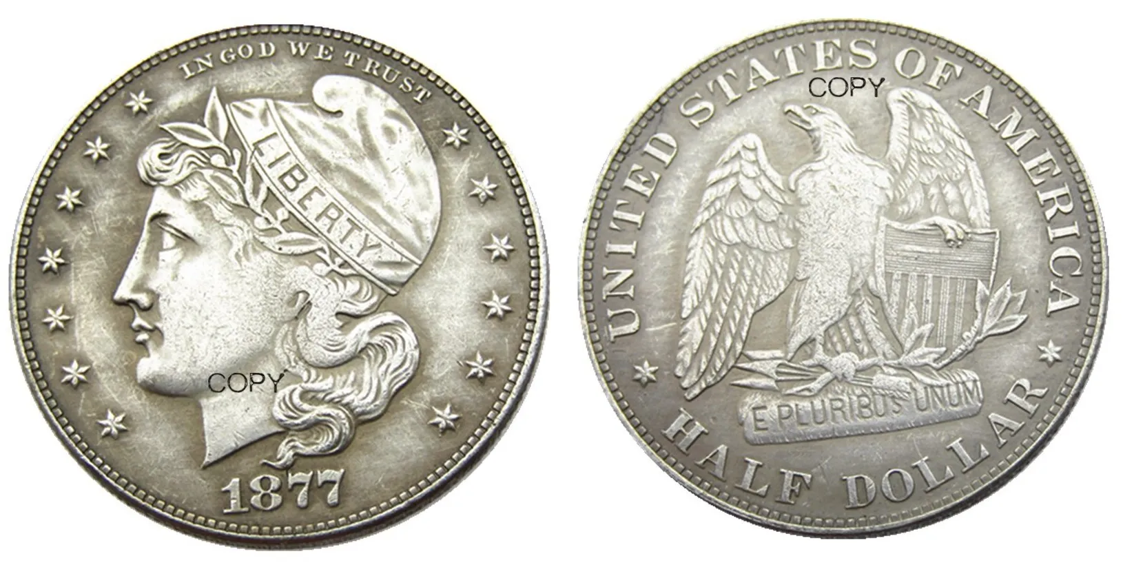 Immerse yourself in history with this detailed replica of the 1877 US half coin, crafted from metal with a vintage, nostalgic design that exudes patriotic charm. The intricate engraving features a side profile of Lady Liberty with flowing hair, wearing a textured fabric cap inscribed with “LIBERTY,” encircled by thirteen stars to represent the original colonies. The top bears the inscription “IN GOD WE TRUST,” while the bold “1877” is centered below her portrait. Framed by a beaded border, the coin showcases a slightly matte metallic surface and fine detailing that evoke the craftsmanship of the late 19th century, making it an ideal decorative piece for collectors and enthusiasts.