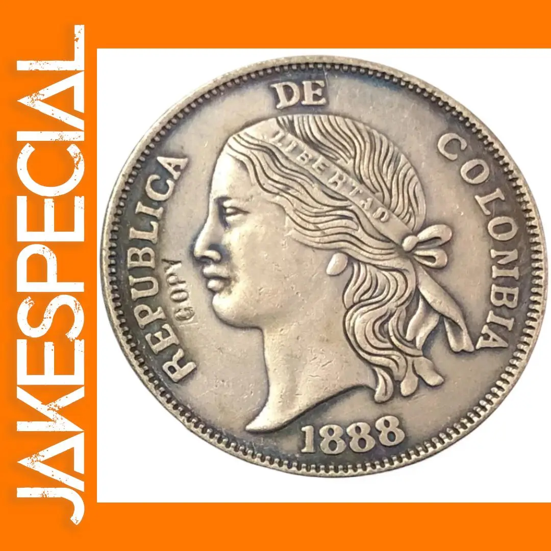 This 1888 Colombia replica showcases a detailed profile of a woman facing left, with flowing, wavy hair tied with a patterned ribbon, set against a textured, antique-inspired surface with subtle patina and tarnish accents. Surrounded by a finely beaded border, the design captures the ornate style of the 1880s, featuring elegant lettering of “REPUBLICA DE COLOMBIA” and the year “1888” at the bottom. Made from high-quality metal, this lightweight replica is durable and perfect for display, blending vintage charm with intricate craftsmanship. An ideal addition for collectors seeking a refined, historical artifact that radiates authentic antique aesthetics.
