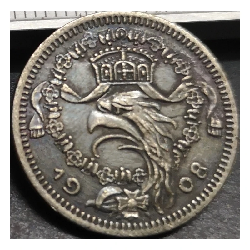Capture a piece of history with this cast metal imitation coin styled as an antique European 25 Pfennig from the 1908-D series, dating from 1900 to 1919. Featuring a vintage, aged appearance with a slightly worn metallic finish, it showcases detailed engraved elements, including large numerals, serifed lettering, an elegant natural motif of a branch with small leaves, and reeded edges for authenticity. This replica coin, crafted using casting techniques, is perfect for collectors and decorative displays, offering a nostalgic glimpse into early 20th-century European coinage with all original design nuances and intricate details.
