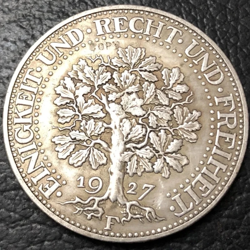 Discover this meticulously crafted replica of the historic German 5 Reichsmark coin from 1927. Made through casting, this coin boasts a detailed, vintage European aesthetic that captures the craftsmanship of the period. Its rich, antique patina finish enhances the textured relief features, including an intricate oak tree with a broad trunk, textured bark, and abundant leaves. The roots extend outward at the coin’s base, adding a natural, organic element. Encircling the upper circumference is a detailed inscription divided by small dots, and a dotted border accentuates its ornate style. This collectible replica is designed to evoke the look of genuine vintage currency, perfect for display, collection, or decorative purposes, delivering a touch of history and craftsmanship to your collection.