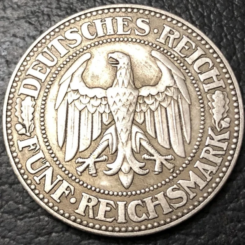 - Crafted via casting to replicate the historic 1927 5 Reichsmark coin with detailed relief and textured surface. Features a vintage European style finish, emphasizing historical authenticity and aesthetic appeal.