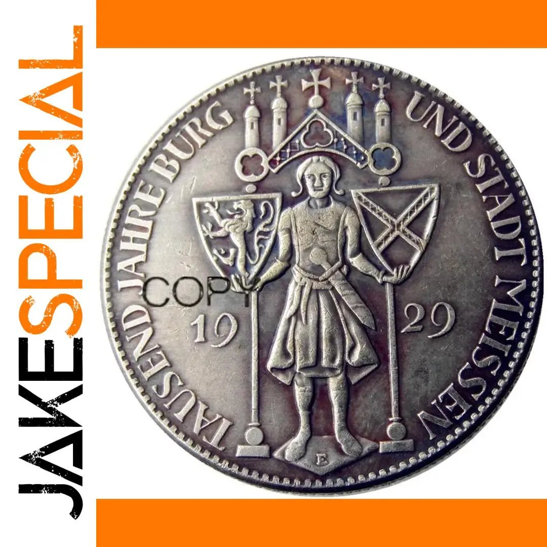 Step back into history with this meticulously crafted replica of the 1929 German Reichsmark, a coin from the Weimar Republic era. Designed to evoke patriotic pride, it features intricate, high-relief details and vintage aesthetics reminiscent of early 20th-century craftsmanship. The central figure, dressed in period attire with stylized hair, stands confidently with outstretched arms, holding shields adorned with a lion emblem and a lattice pattern. The top showcases five crosses and spire-like towers topped with crosses, echoing historic architecture. Encircling the figure are ornate inscriptions, including “DEUTSCHES REICH BURG,” “UND STADT MESSEN,” and the split date “19” and “29.” This striking piece combines nostalgic design with durable metal craftsmanship, perfect for collectors and history enthusiasts.